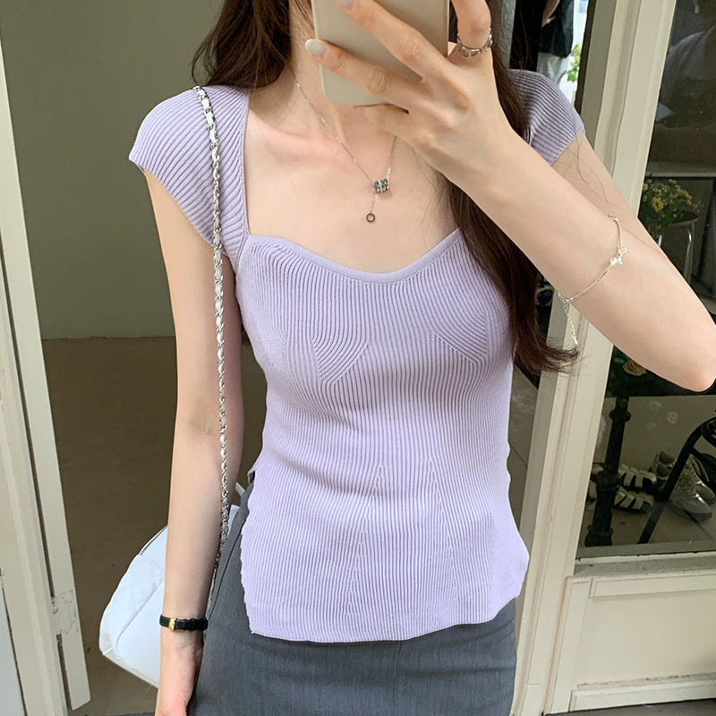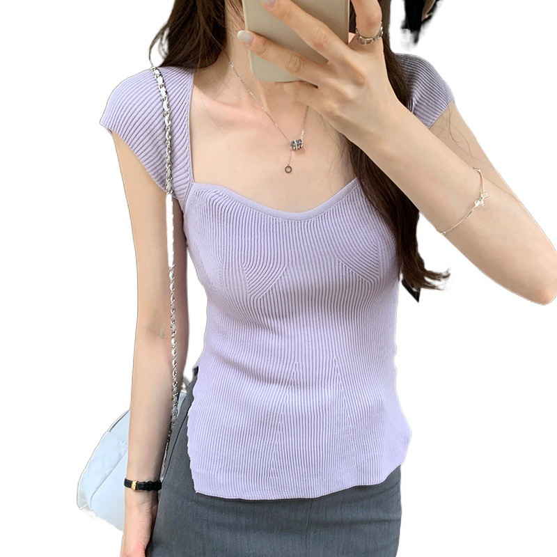 桃心领口设计感插肩短袖针织衫女夏新款开叉气质上衣