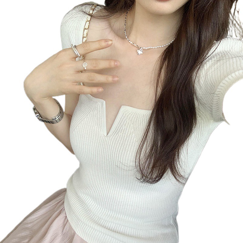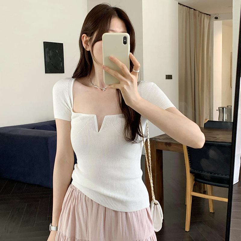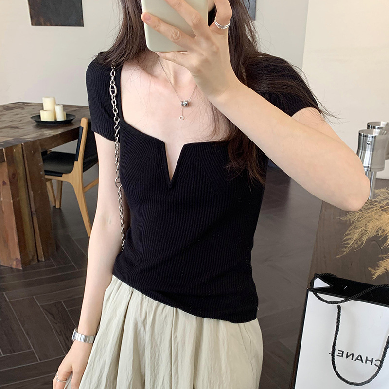 欧美风心机小v领复古坑条纹针织打底衫女夏百搭修身短袖T恤