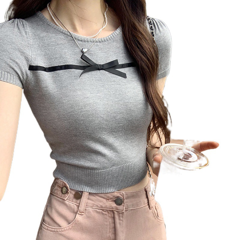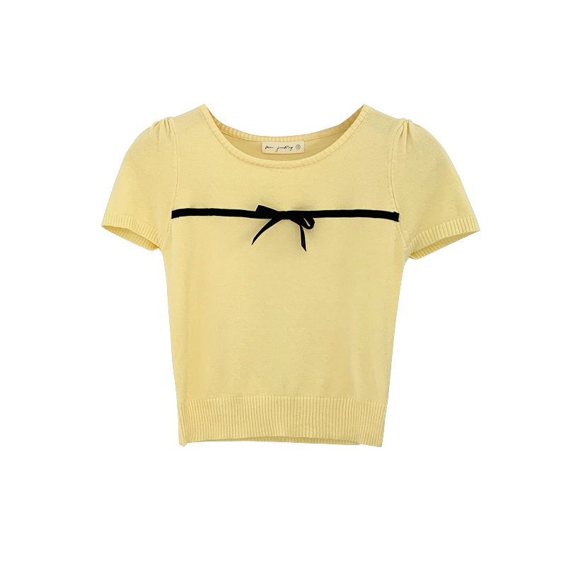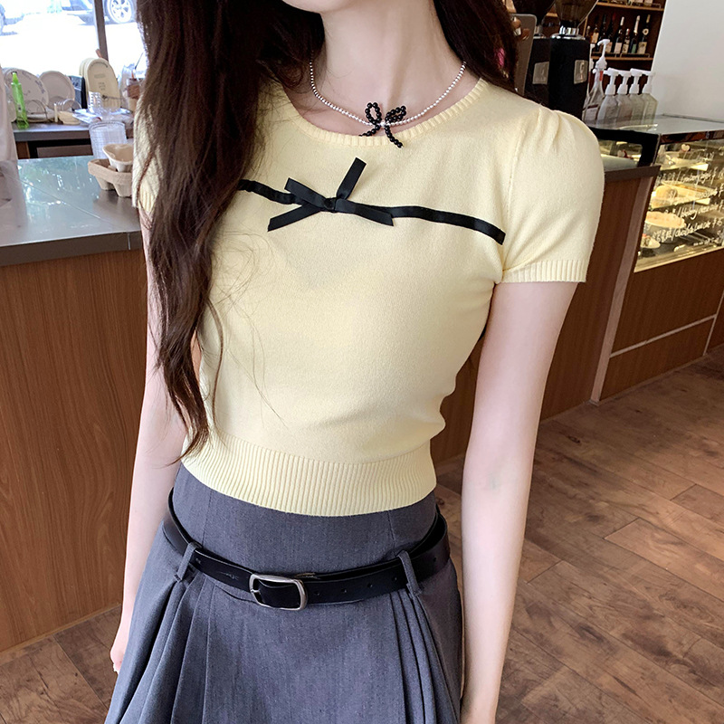 泡泡袖撞色蝴蝶结短袖针织衫女夏新款短款甜美显瘦上衣