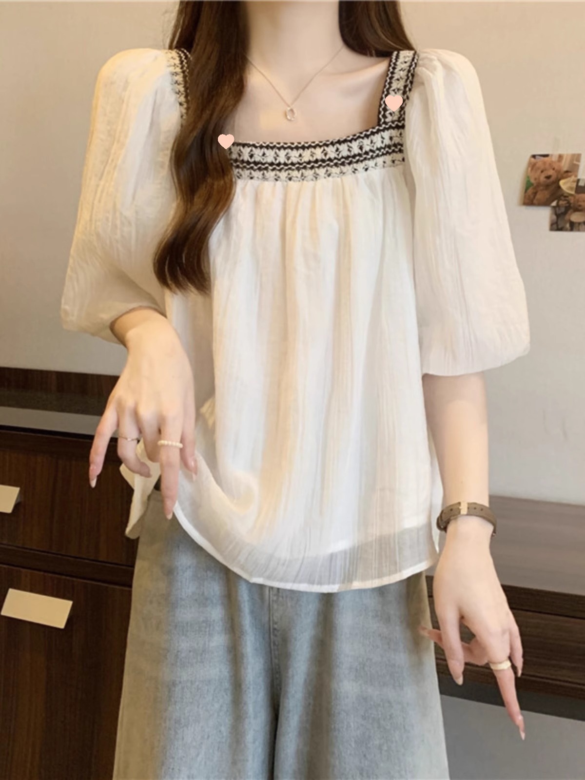 大码法式泡泡袖雪纺衬衫女夏季新款方领娃娃衫胖MM遮肚显瘦上衣潮