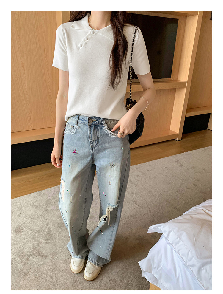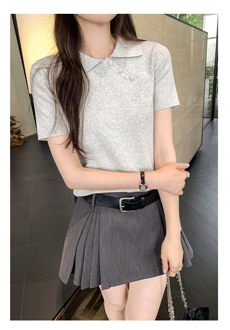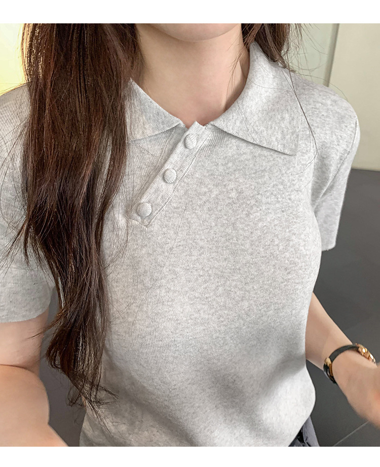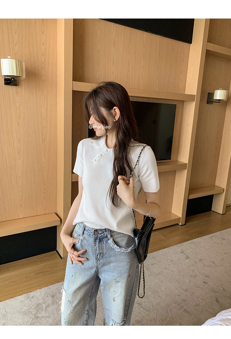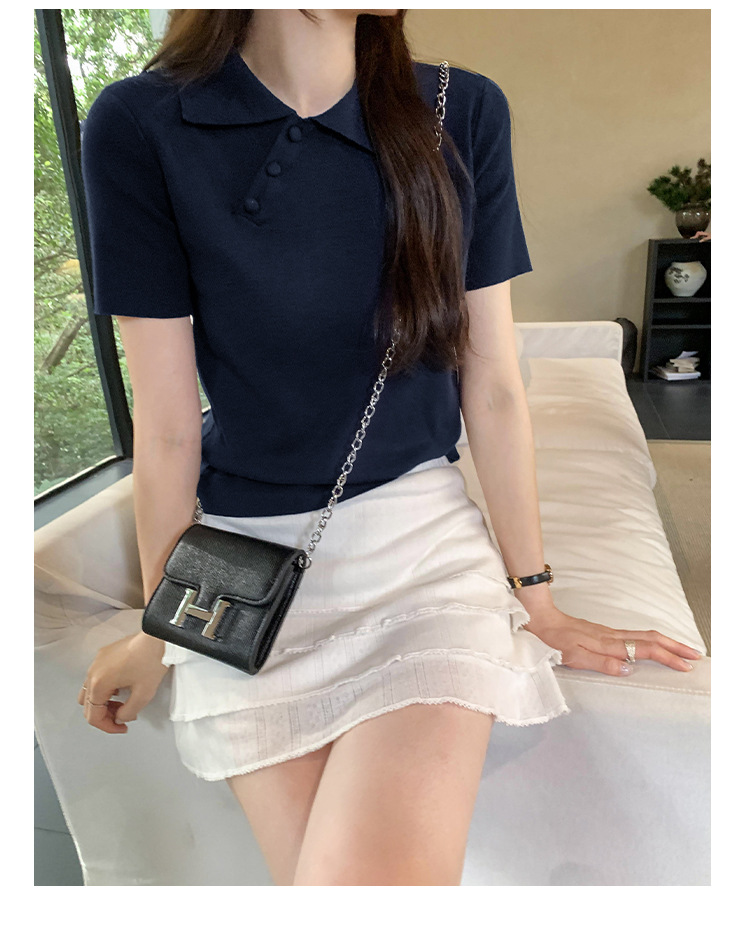 品牌斜扣翻领薄款短袖针织衫女夏季新款新中式国风复古上衣