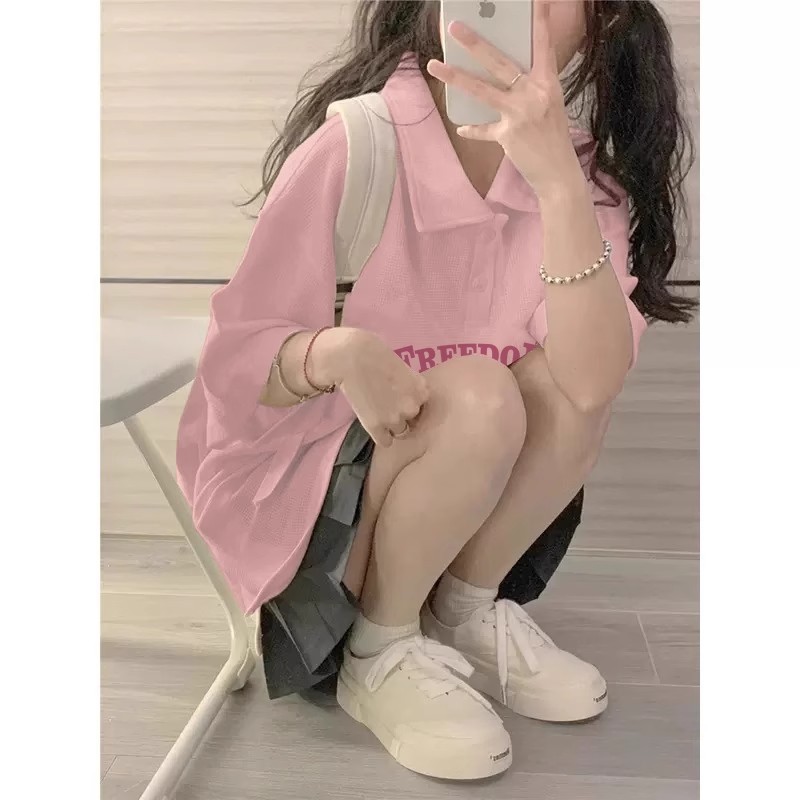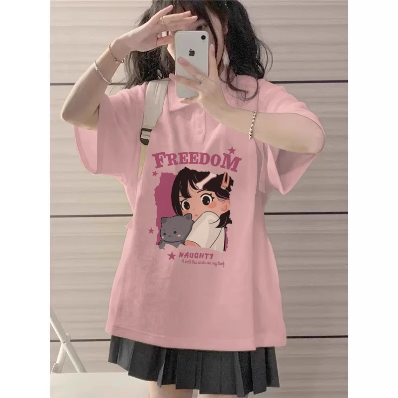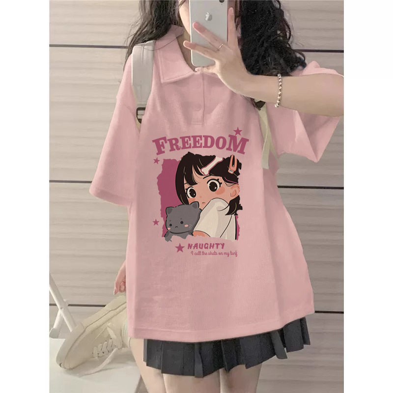 粉色正肩Polo领短袖t恤女夏季小个子学生宽松慵懒风港味chic上衣
