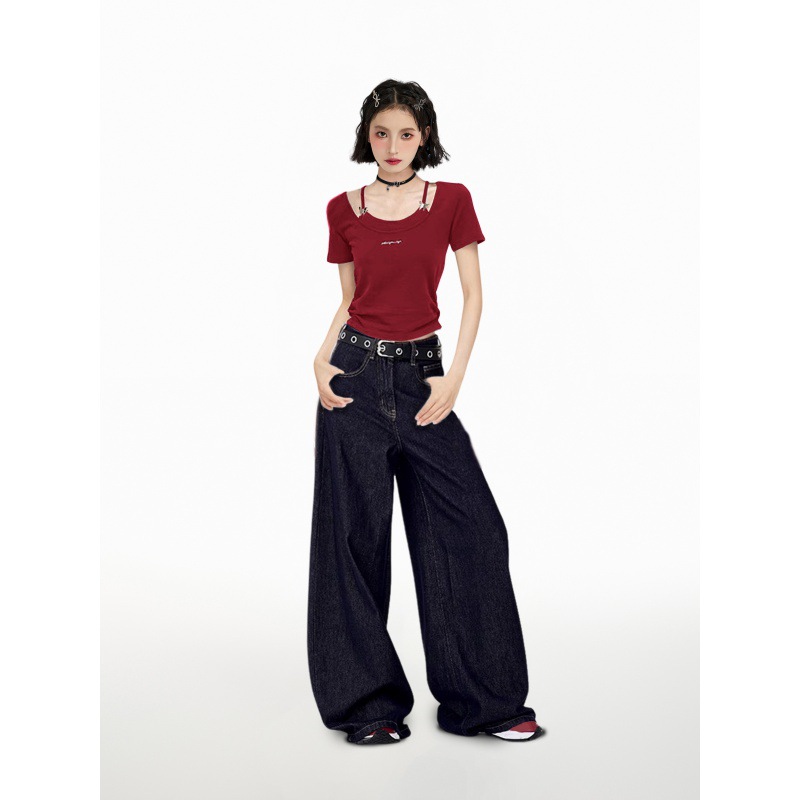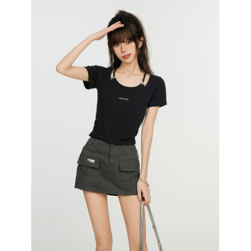 跨境刺绣五金假两件辣妹短袖正肩修身短袖T恤美式
