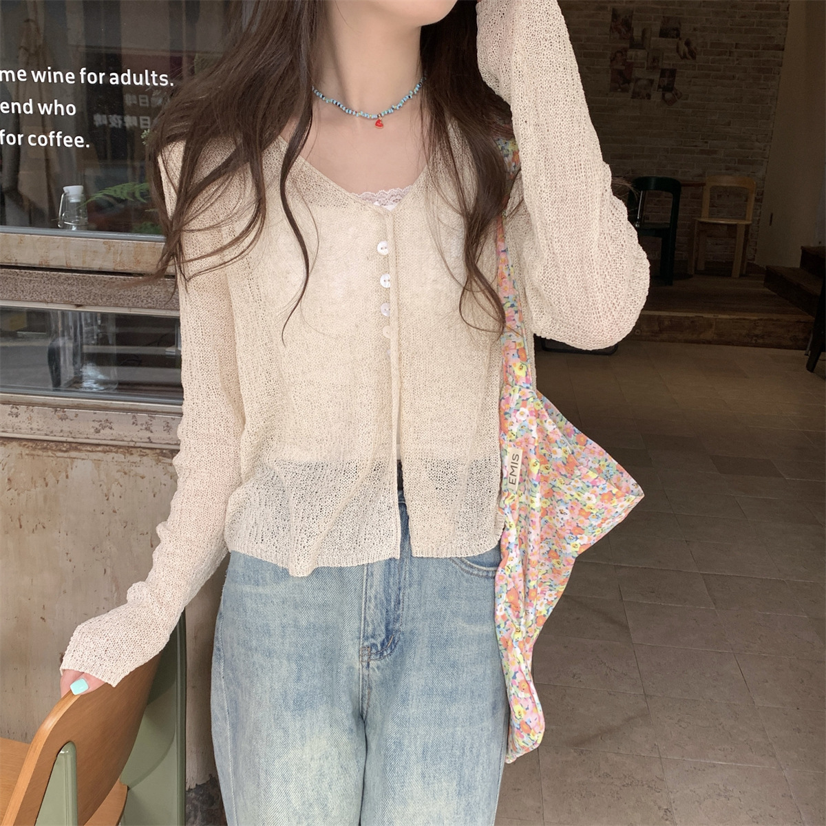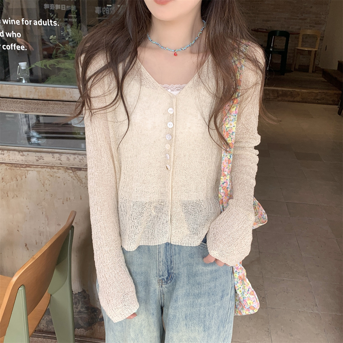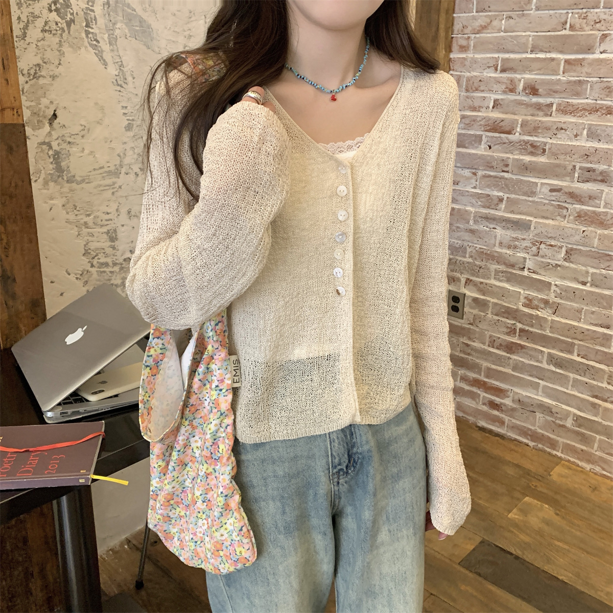 韩系气质新款长袖防晒针织衫女夏微透外搭宽松薄款开衫短款上衣