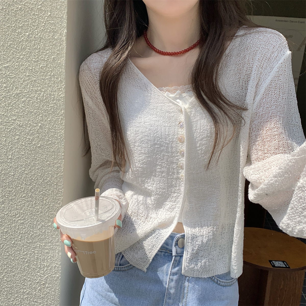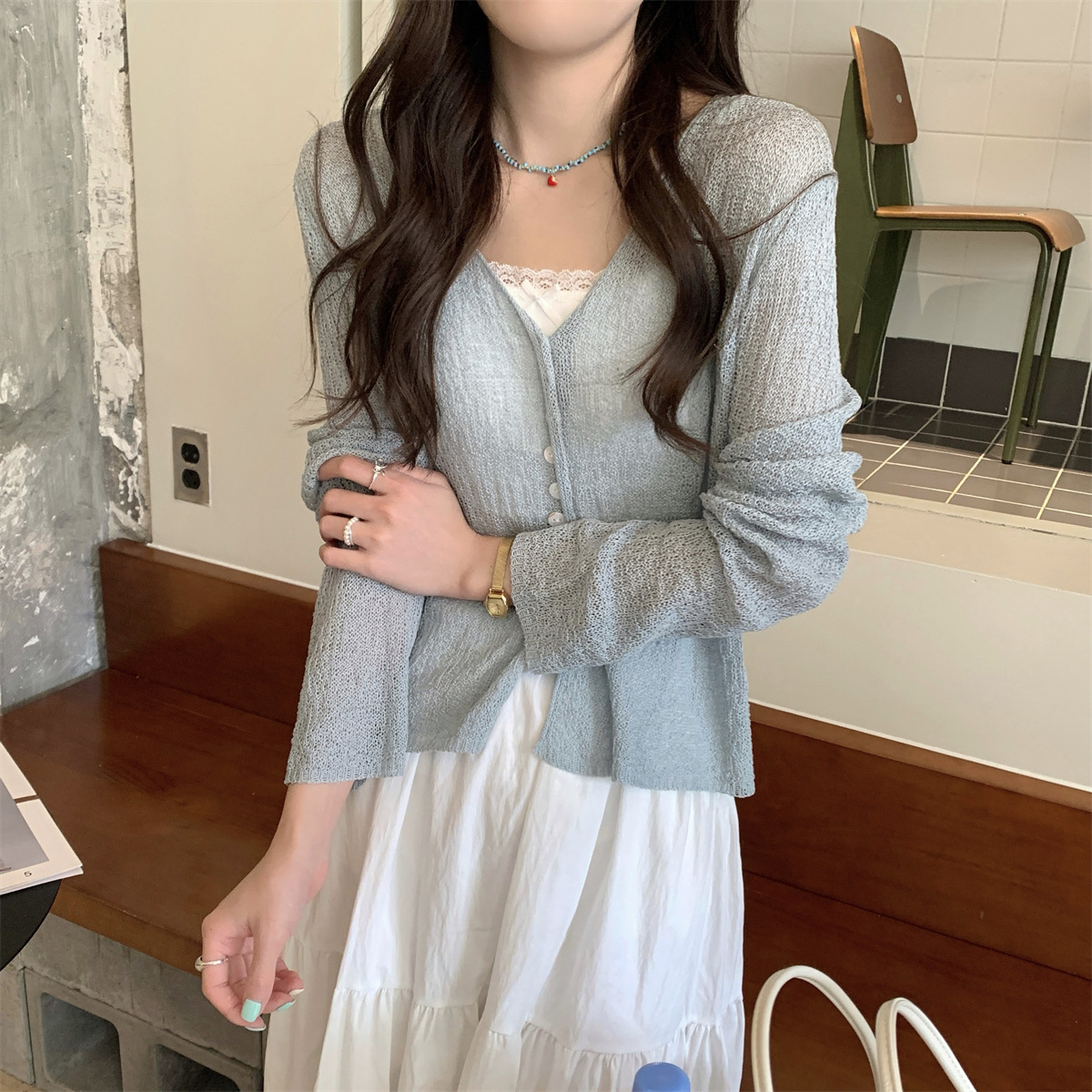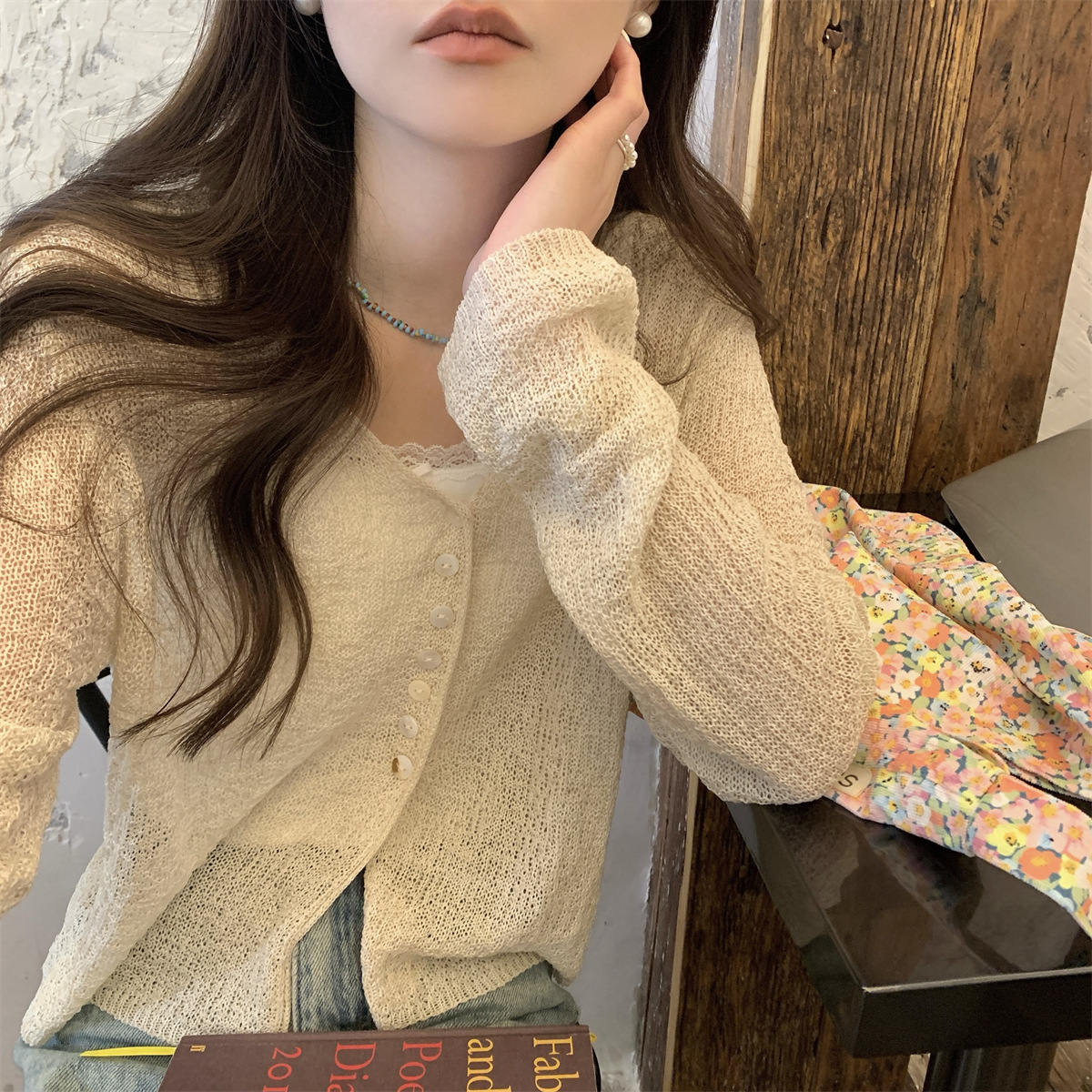 韩系气质新款长袖防晒针织衫女夏微透外搭宽松薄款开衫短款上衣