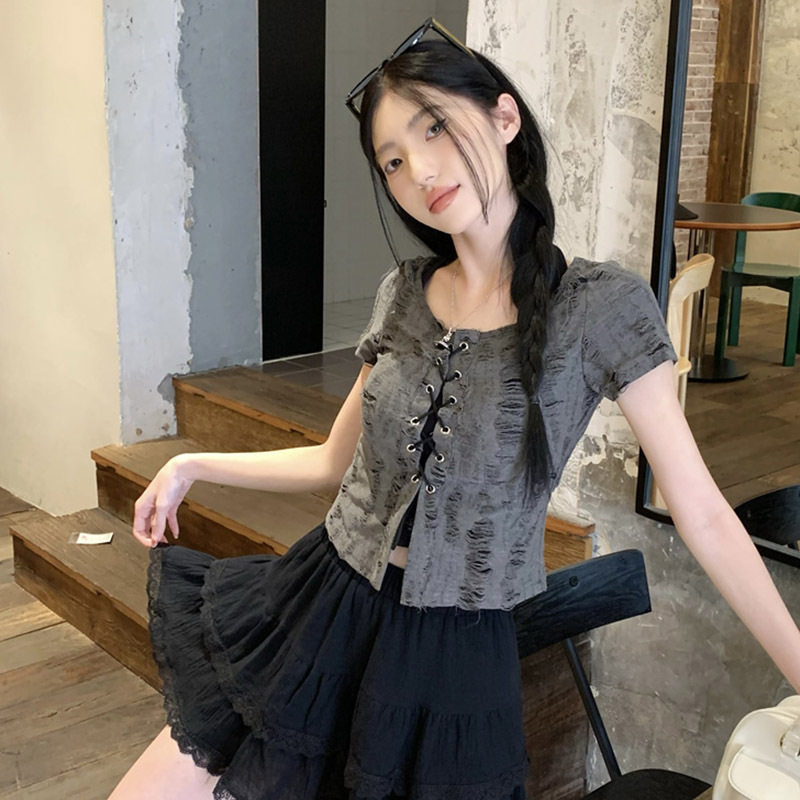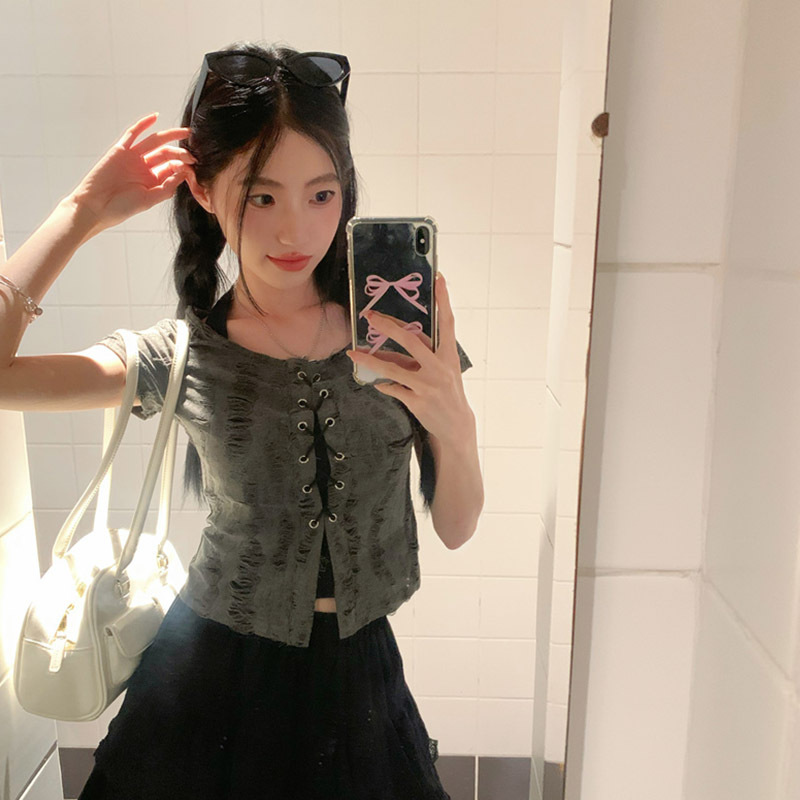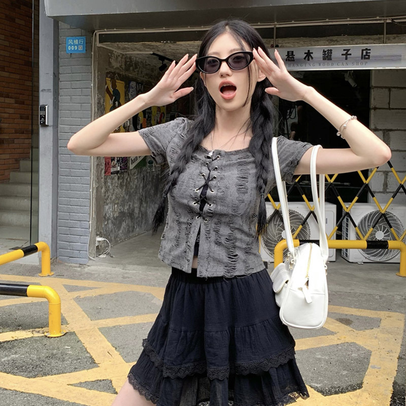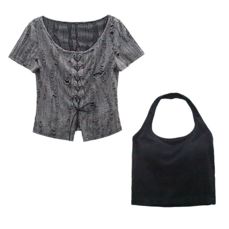 废土风挂脖破洞上衣女夏季绑带修身显瘦方领破洞短袖T恤两件套ins