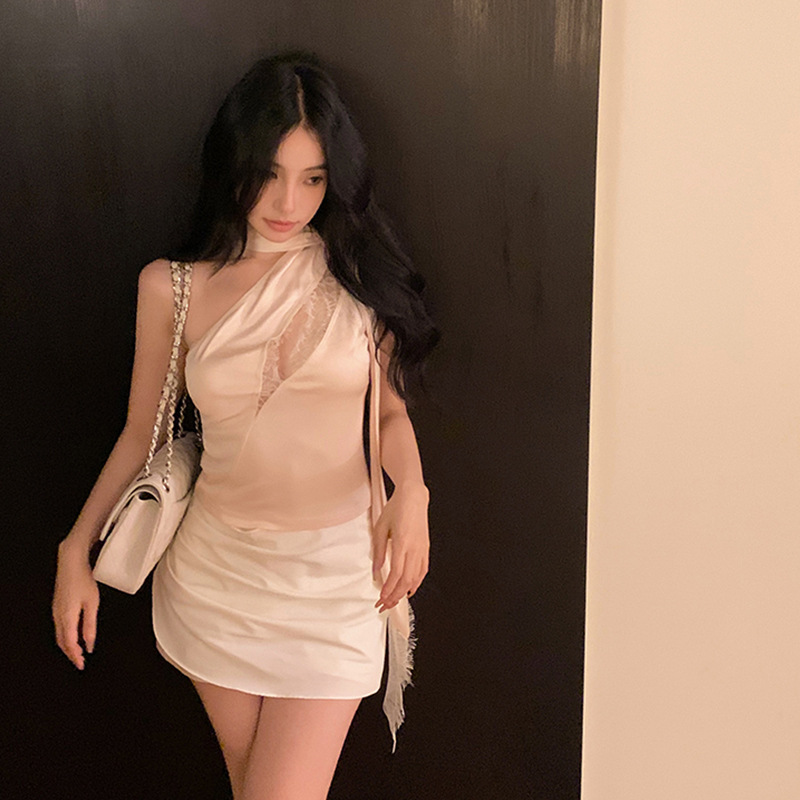 跨境性感蕾丝拼接飘带斜肩挂脖小背心女夏季镂空辣妹短款上衣外穿