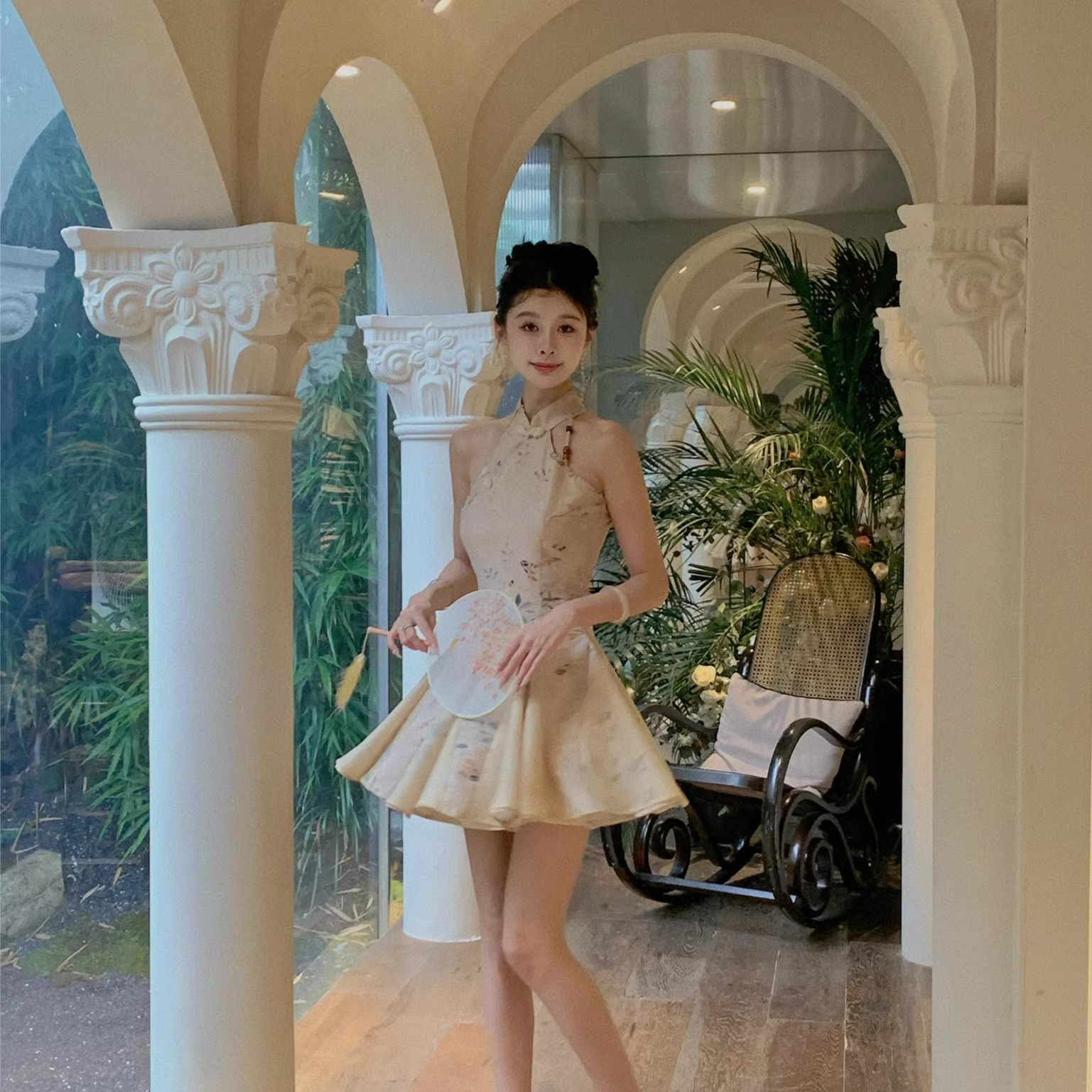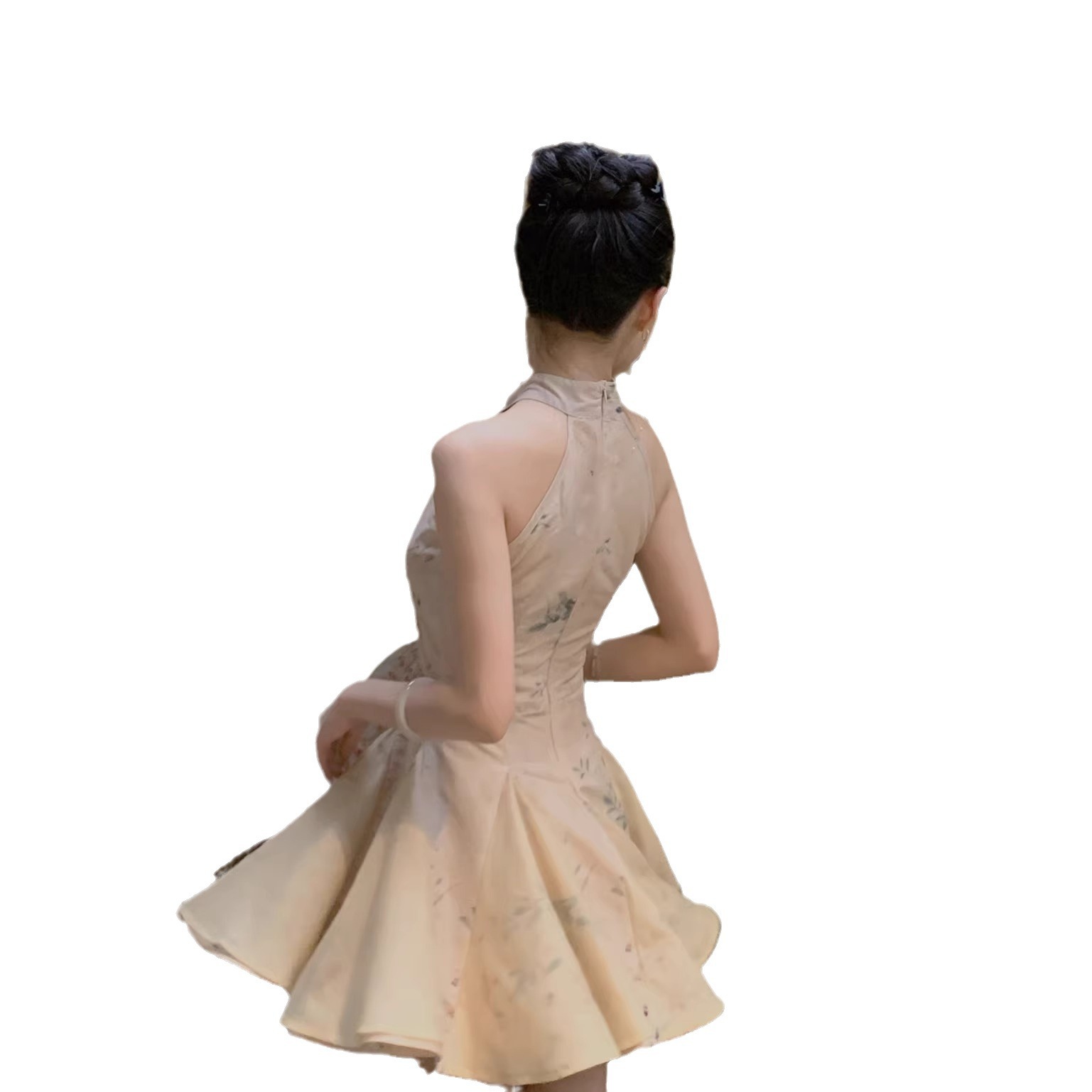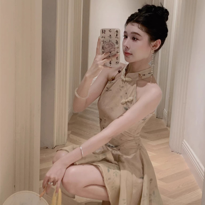 新中式国风挂脖连衣裙女夏季新款复古印花拼接收腰显瘦裙子
