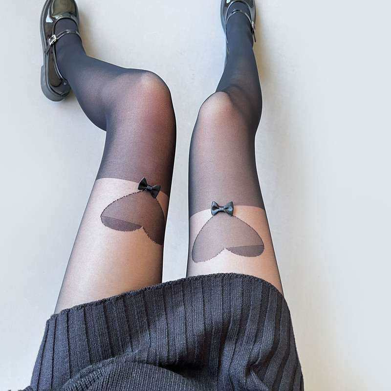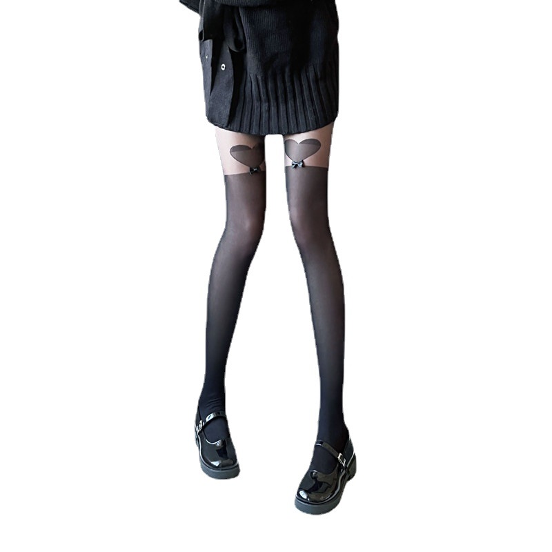 可爱甜美少女爱心提花拼接假大腿蝴蝶结白丝袜女假高筒黑丝连裤袜