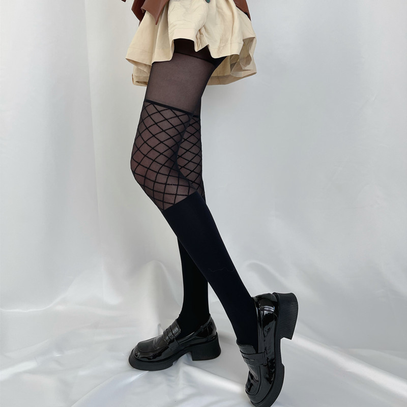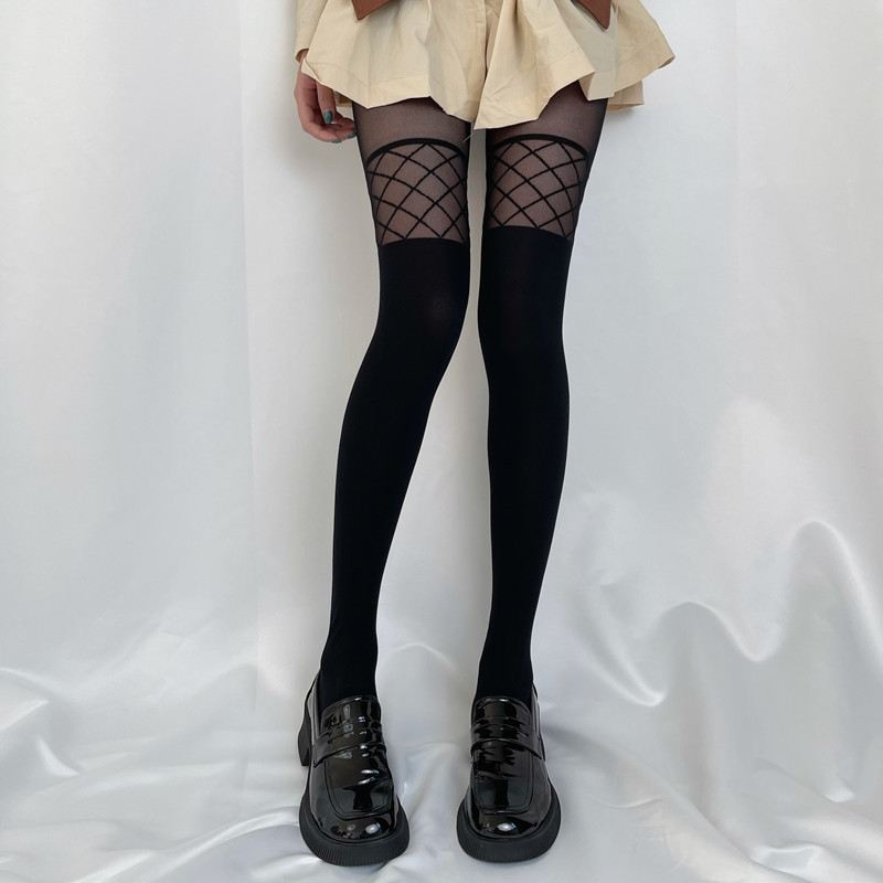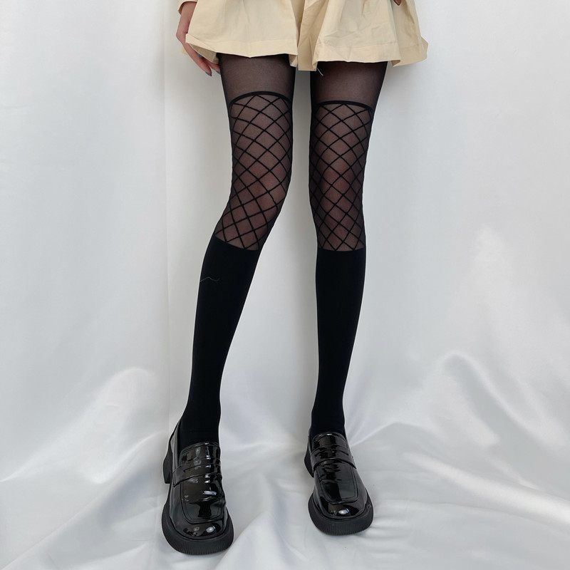 春夏女暗黑jk黑丝大腿袜假高筒拼接小腿袜菱形格设计感辣妹丝袜潮