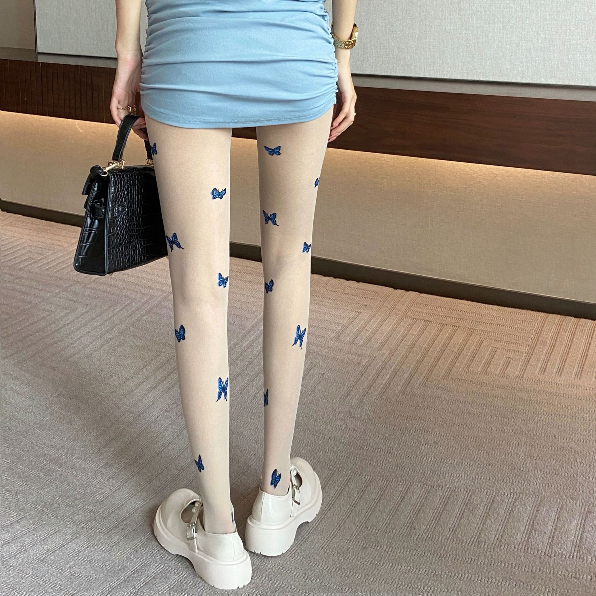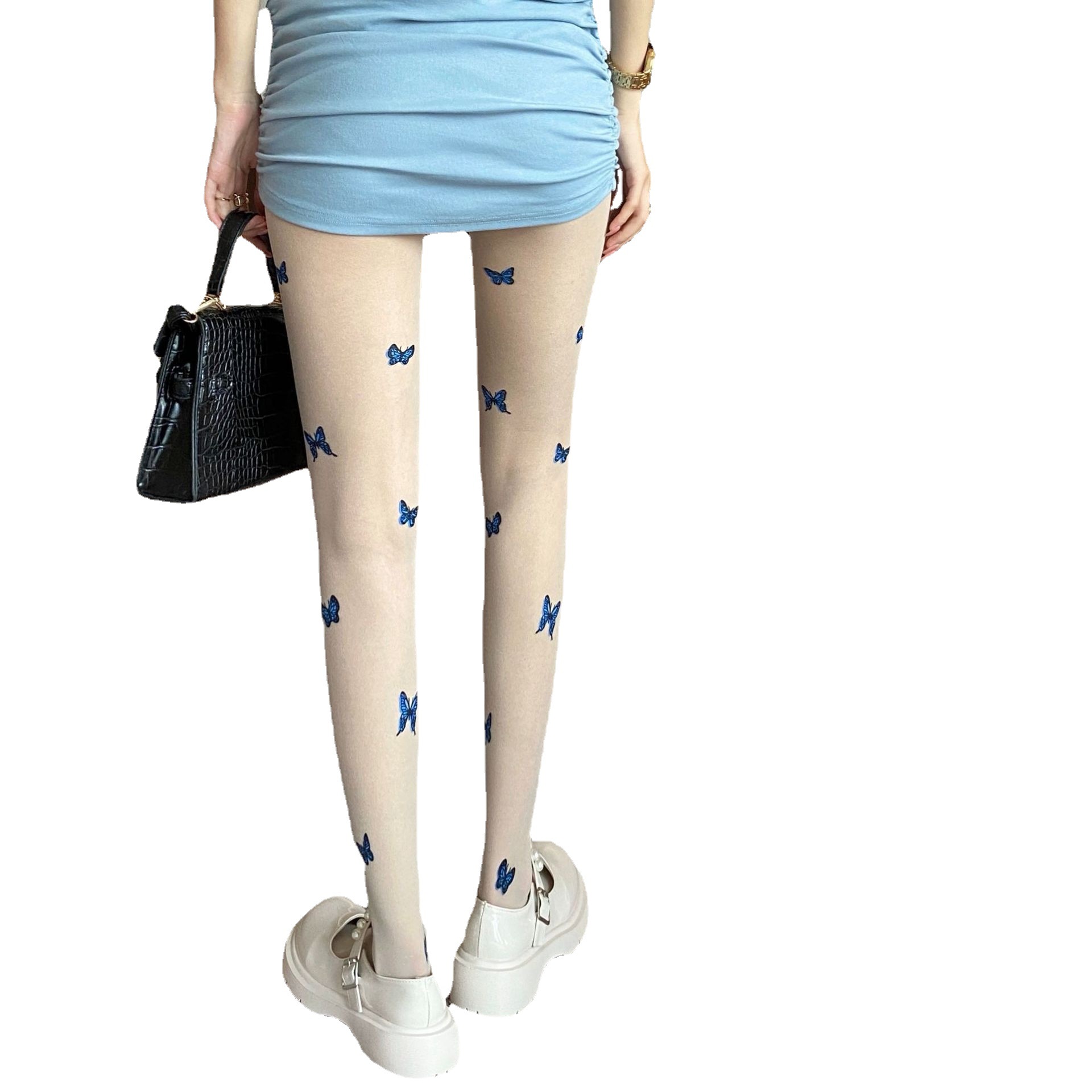 春夏新品甜美仙女蓝色蝴蝶温柔风印花包芯丝奶白薄款提花打底丝袜