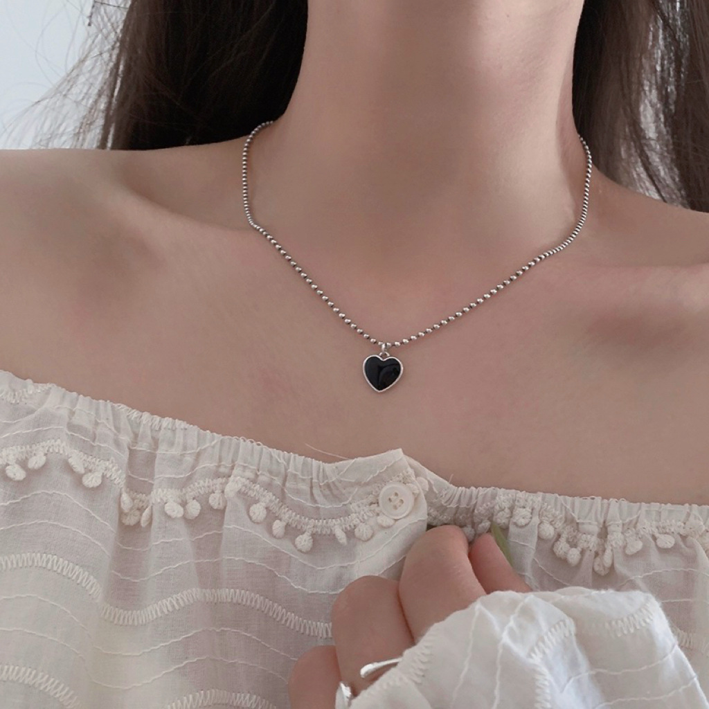 日韩新款黑色滴油爱心吊坠圆珠链项链女简约小众少女甜酷风锁骨链
