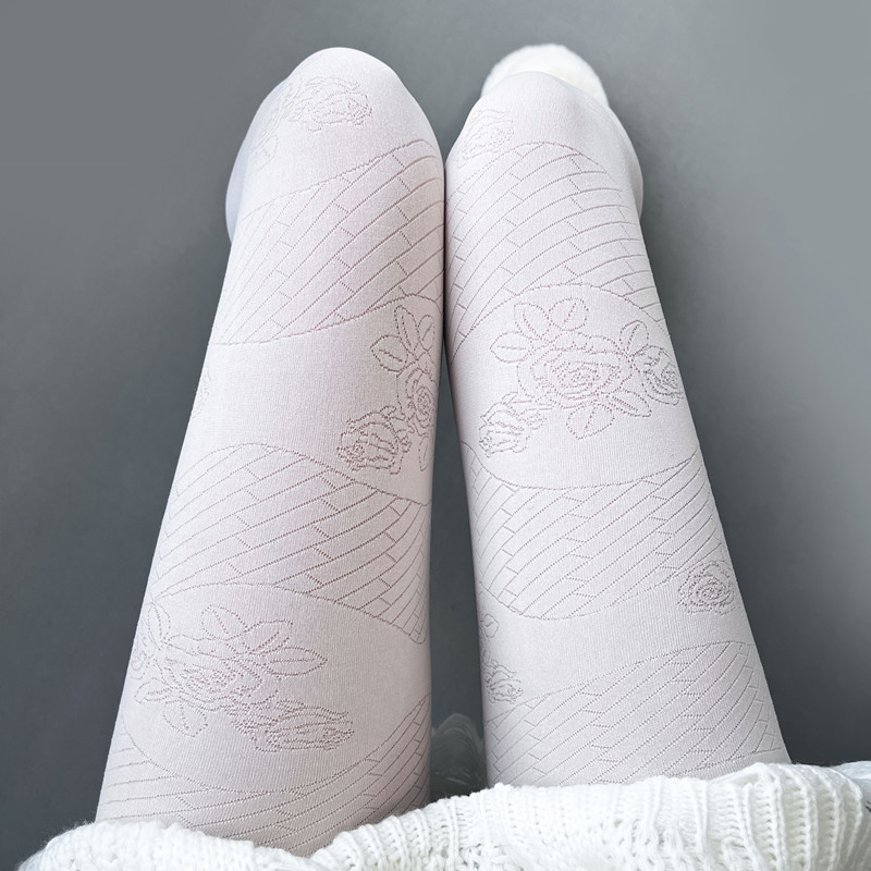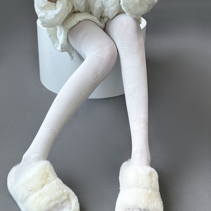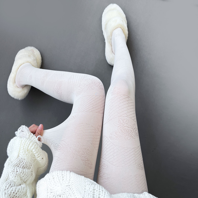 原创纯欲风玫瑰花朵斜条纹格子双拼奶白色丝袜唯美显瘦连裤袜女