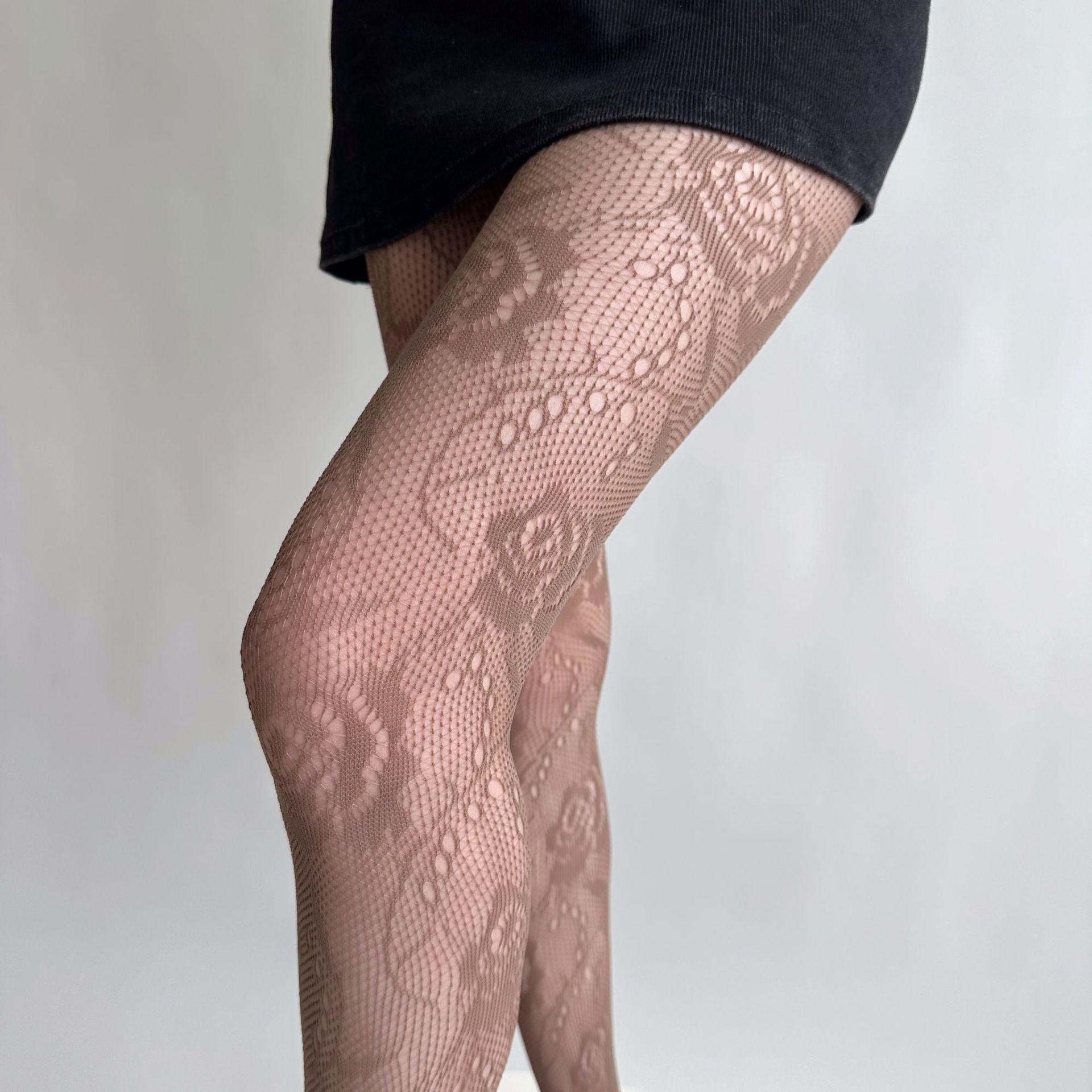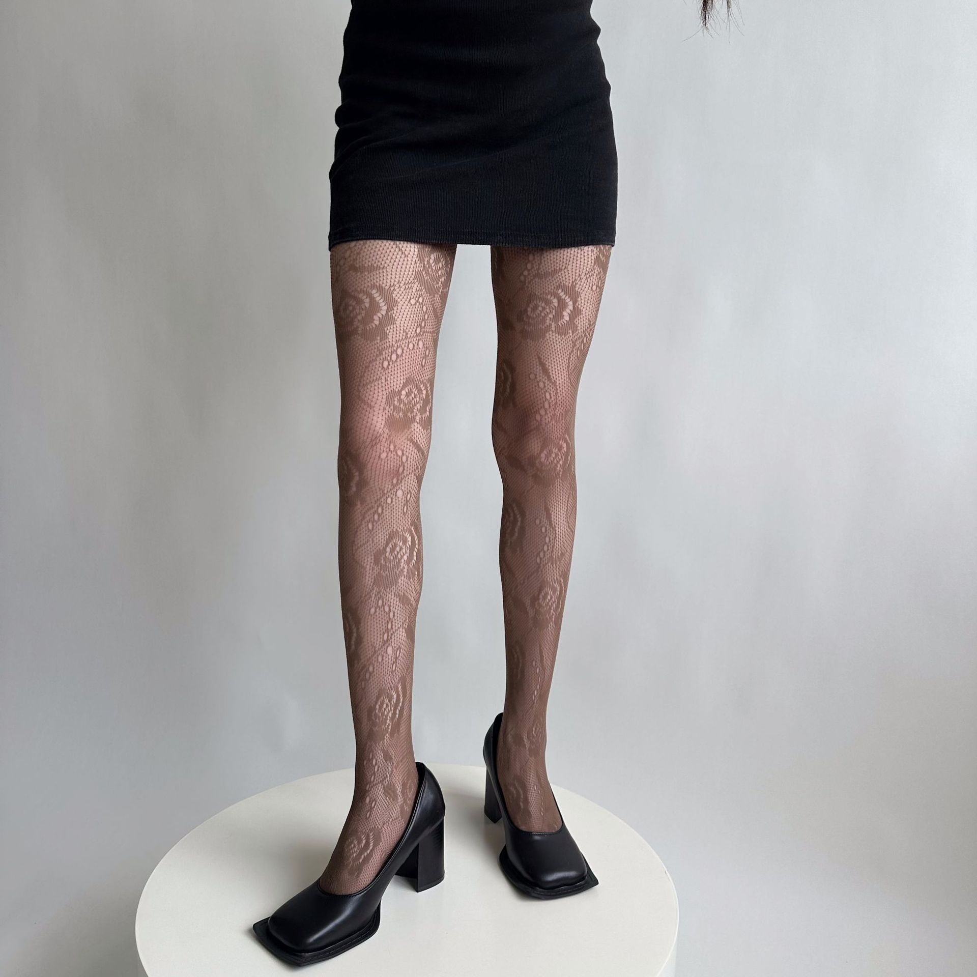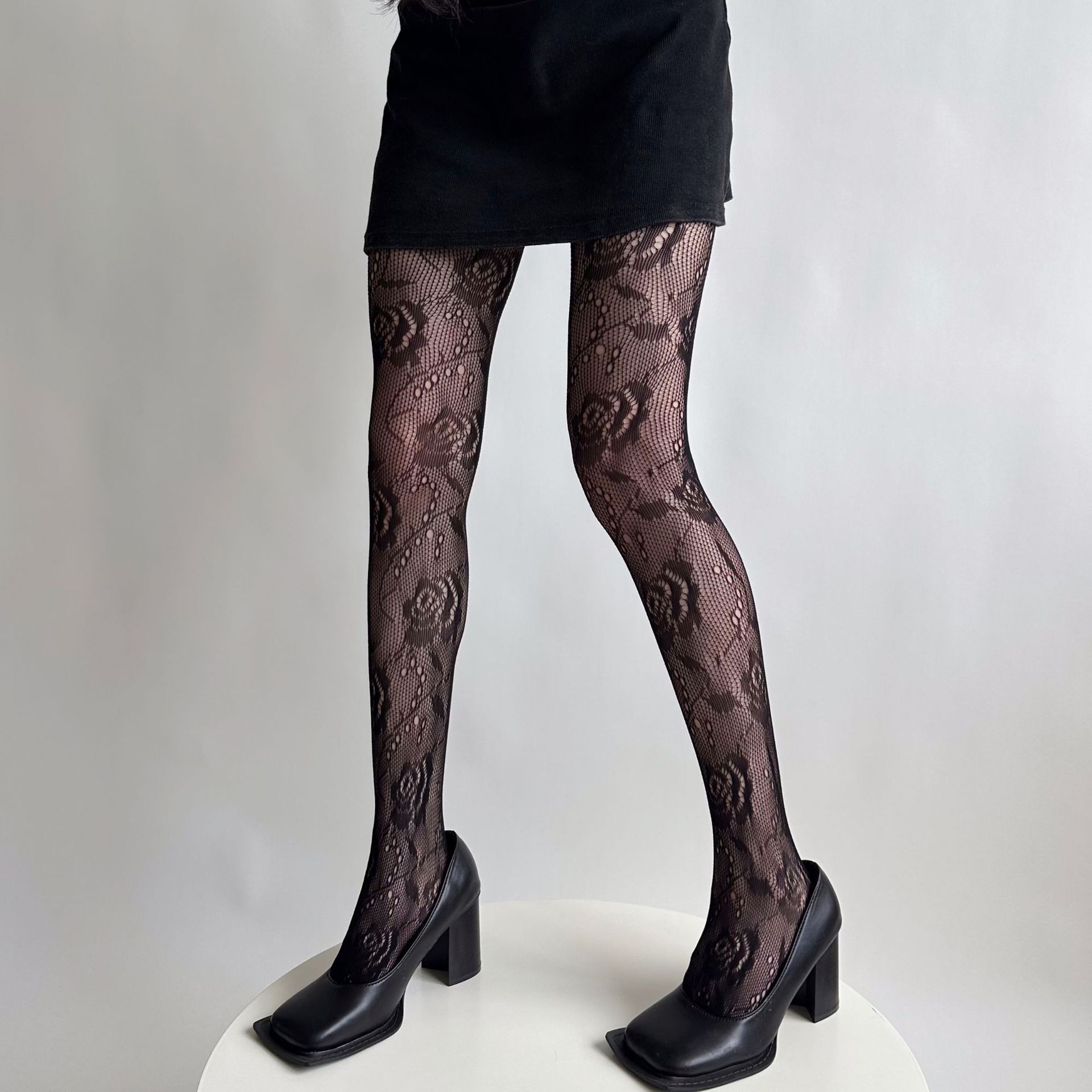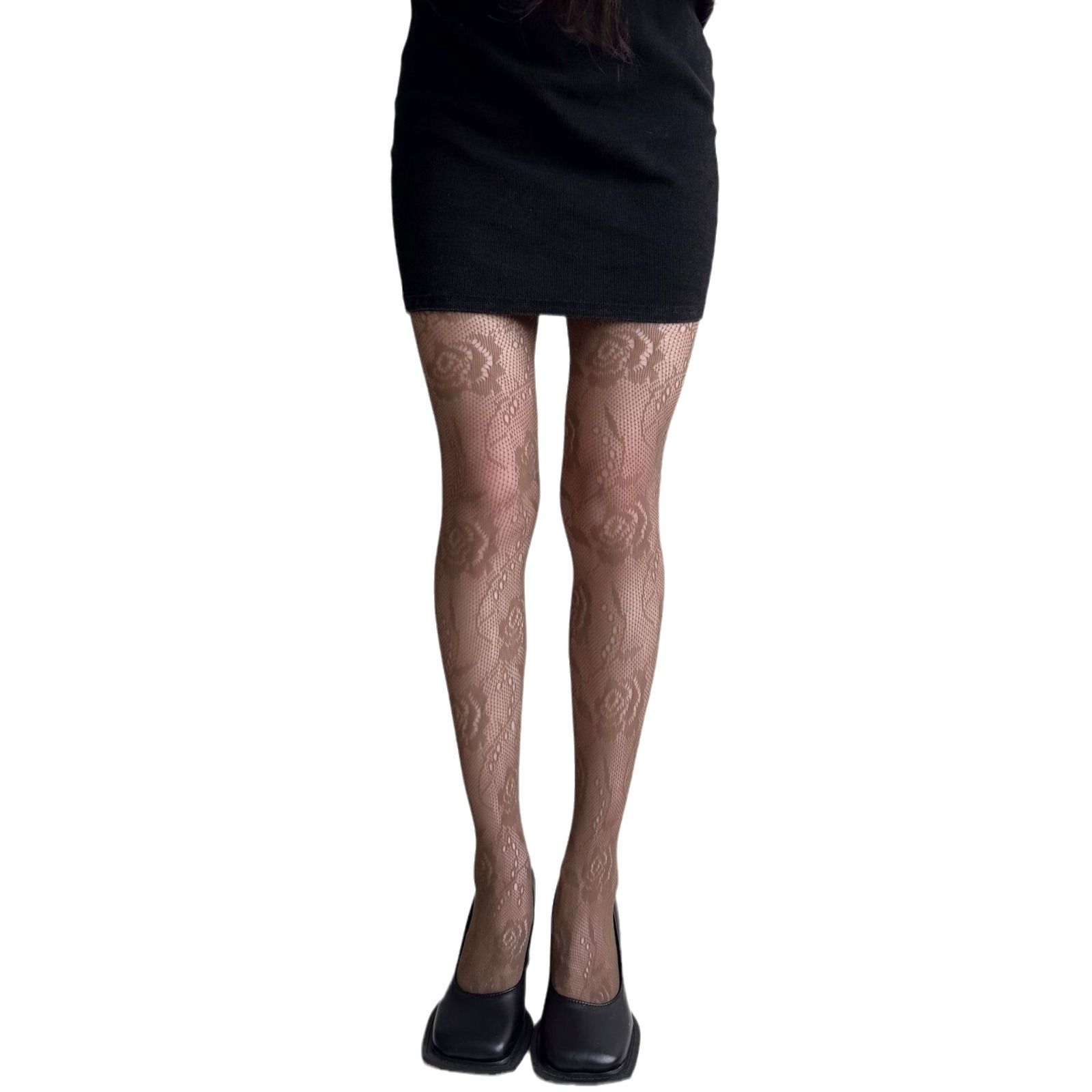 秋季复古蕾丝黑色渔网袜中式风玫瑰花镂空提花纯欲棕色打底连裤袜