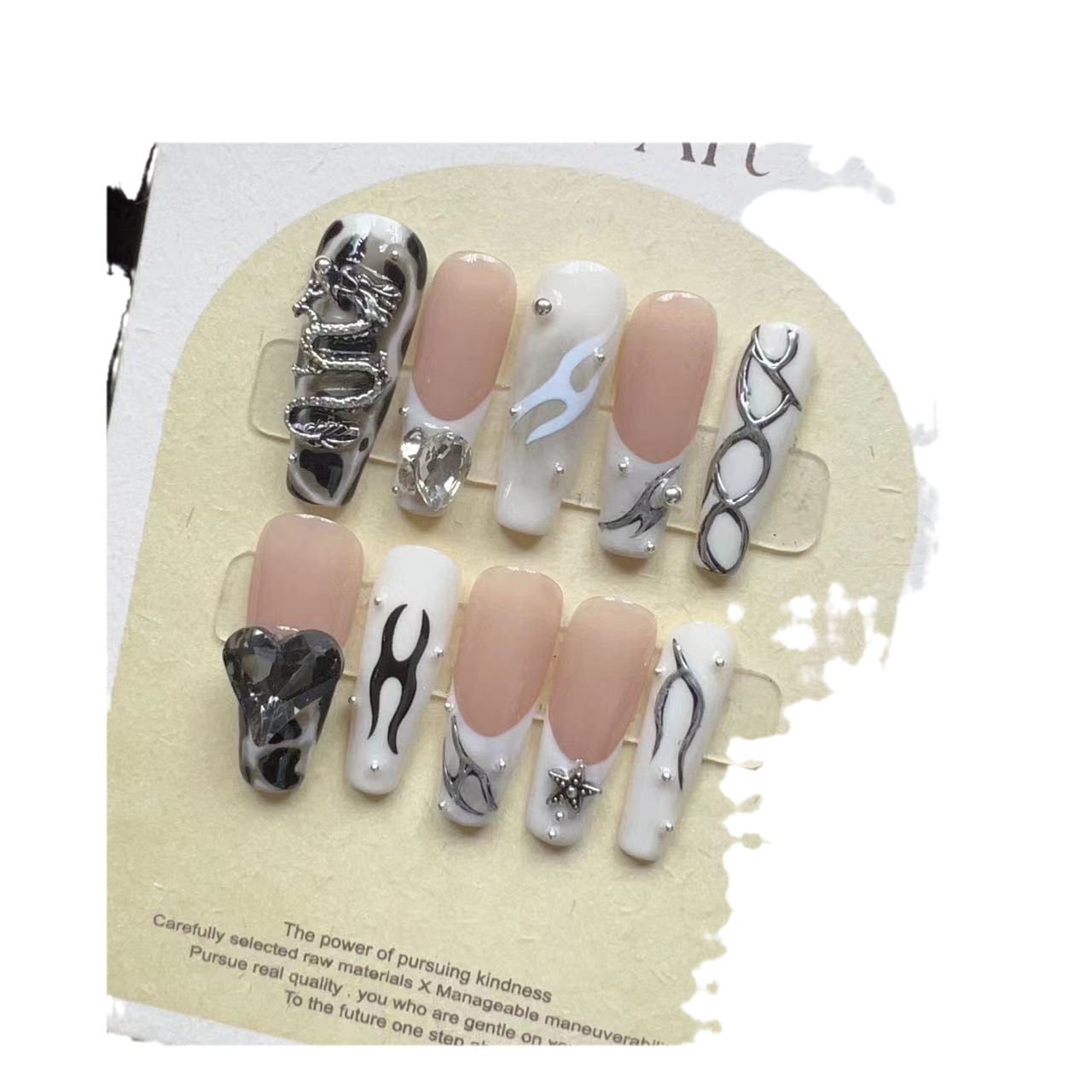 手工美甲穿戴甲假指甲贴片个性小众重工法式黑色豹纹中国风龙戏珠