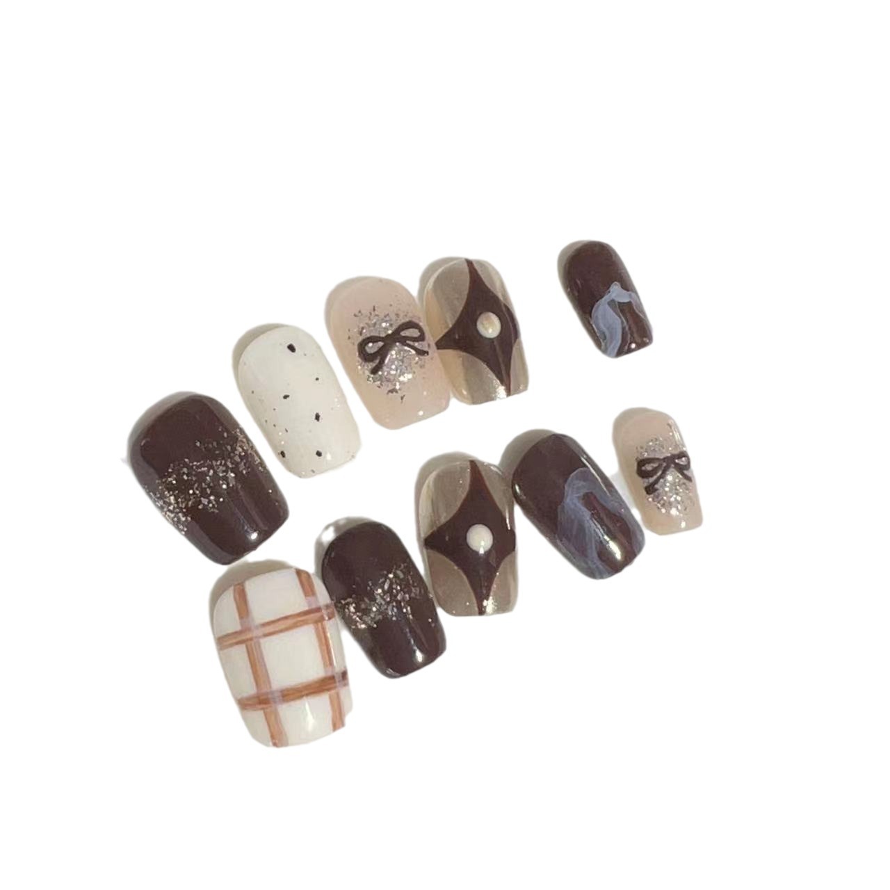 实拍穿戴甲纯手工美甲成品假指甲贴片秋冬新款咖色显白手绘卡通