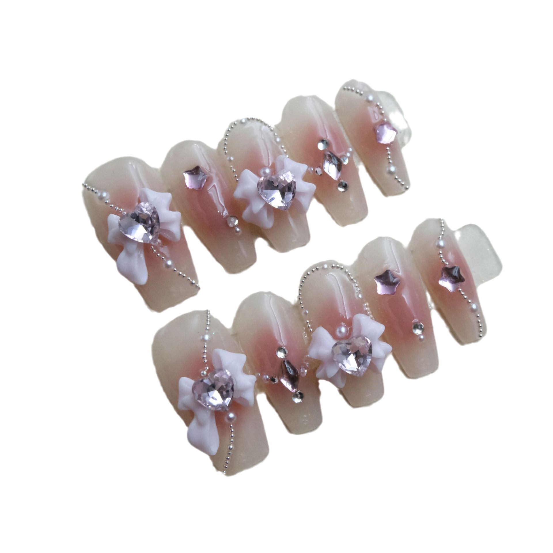纯手工美甲穿戴甲指甲贴高级气质贵妇梦幻粉红芭蕾甜心蝴蝶结美甲