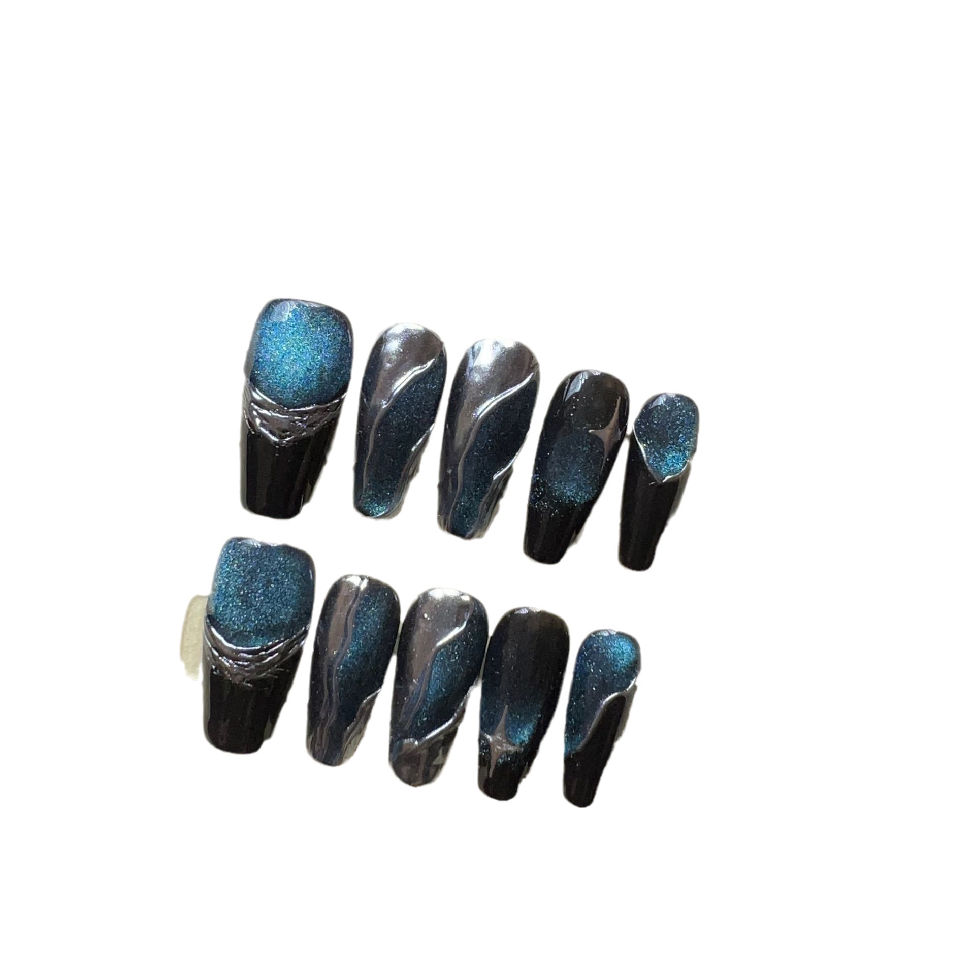 黛瑞森纯手工美甲穿戴甲假指甲贴片高级星空蓝色猫眼异形魔镜粉