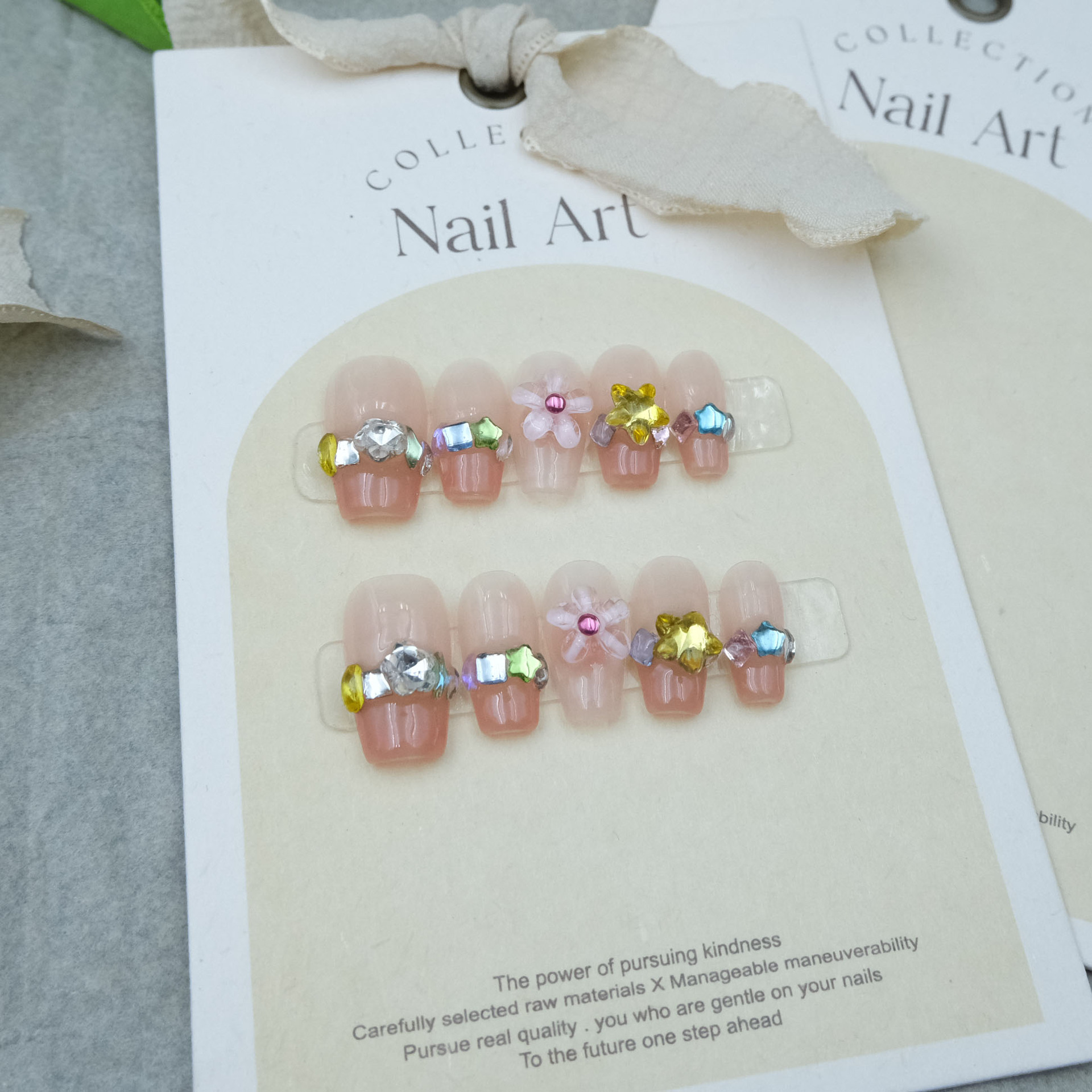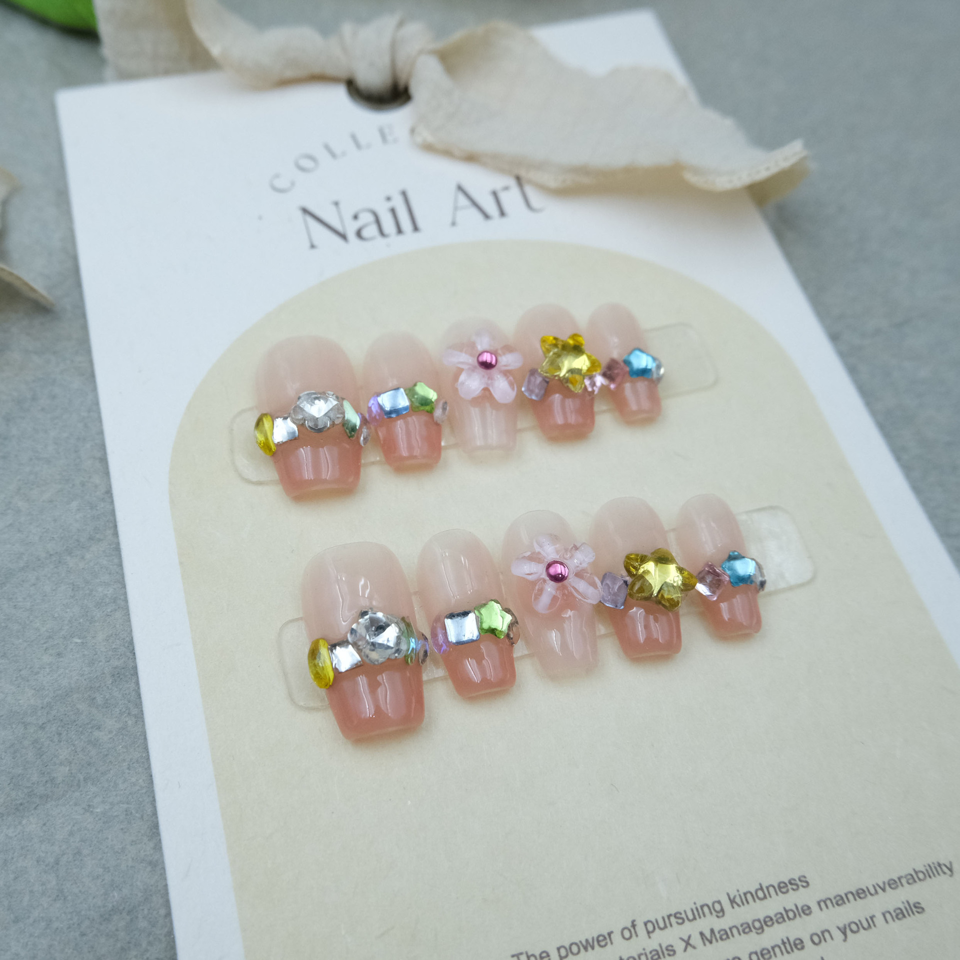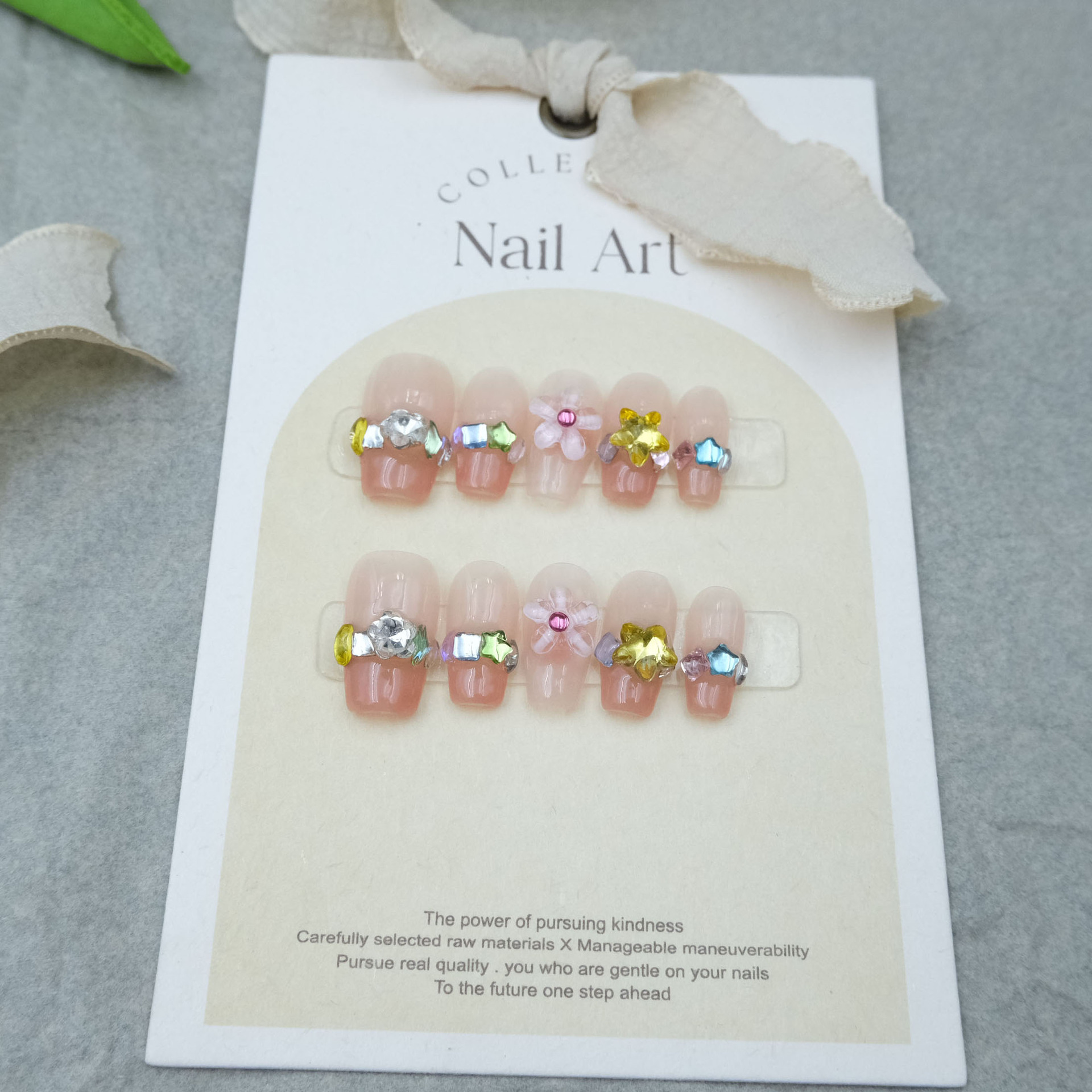 手工美甲穿戴甲指甲贴奶黄色法式泡泡珠极光爆闪钻气质小红书同款