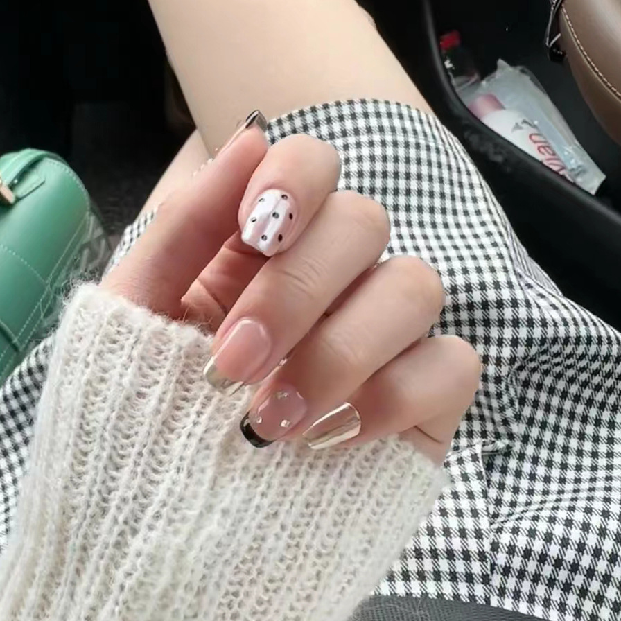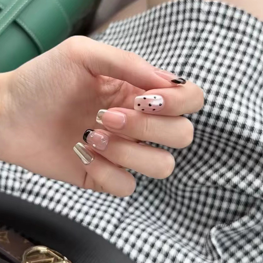 纯手工美甲穿戴甲指甲贴高级辣妹黑边法式魔镜波点小红书爆款学生