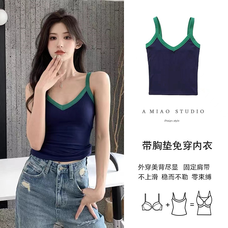 吊带背心女外穿内搭带胸垫修身显瘦辣妹美背打底背心V领撞色上衣