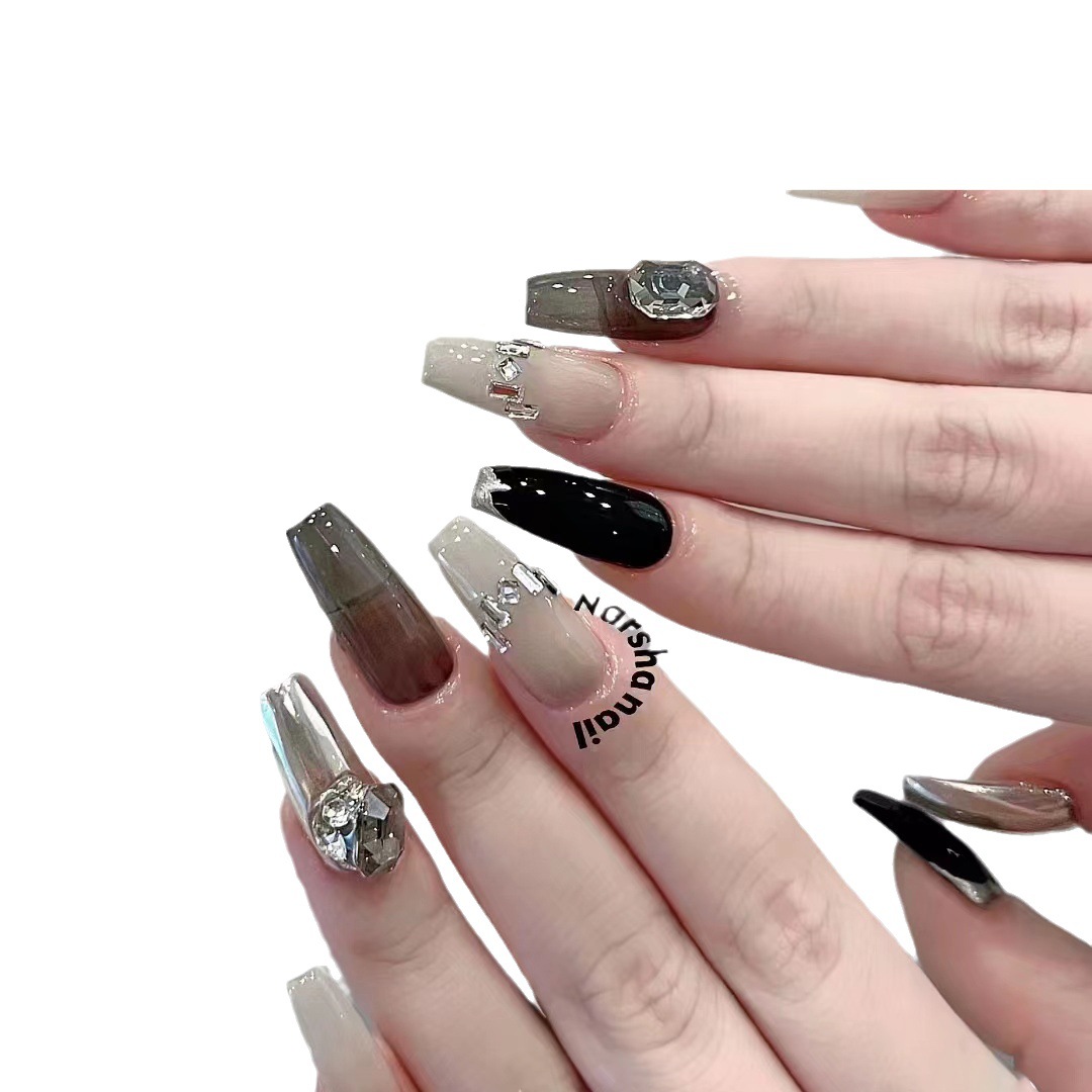 纯手工美甲穿戴甲假指甲贴片辣妹秋冬新款爆闪钻暗黑高级魔镜裸色