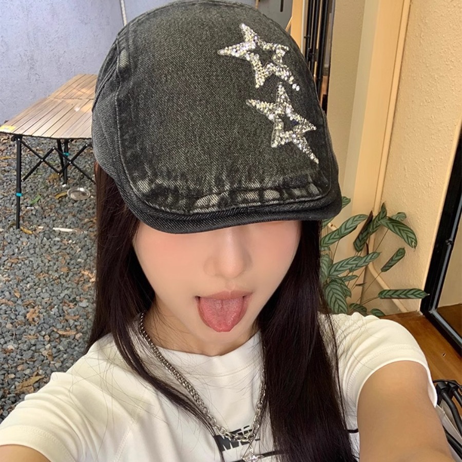 原创做旧水洗牛仔星星前进帽子女复古艺术家画家帽新款鸭舌贝雷帽