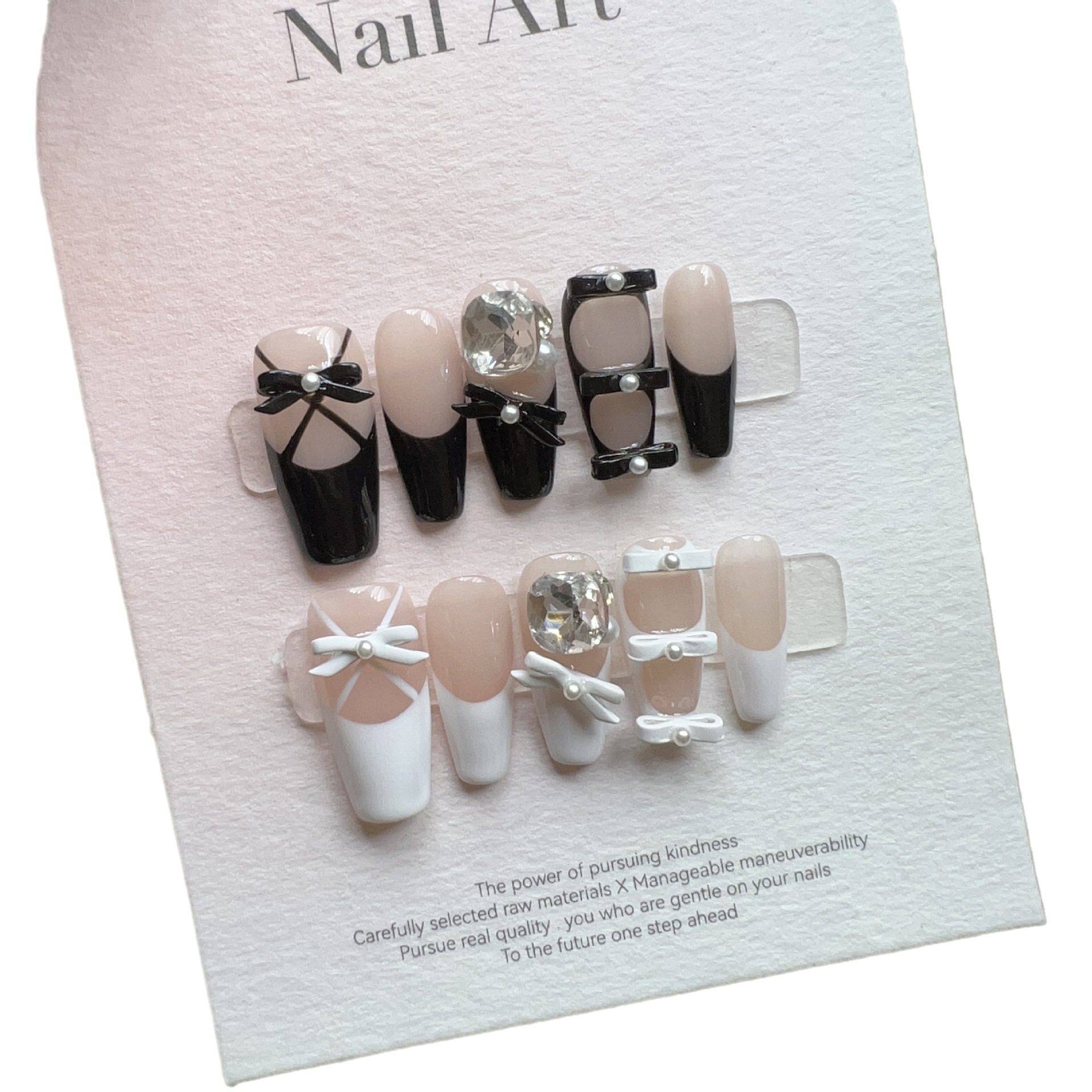 纯手工美甲穿戴甲假指甲贴片网红爆款黑白AB款芭蕾舞鞋立体蝴蝶结