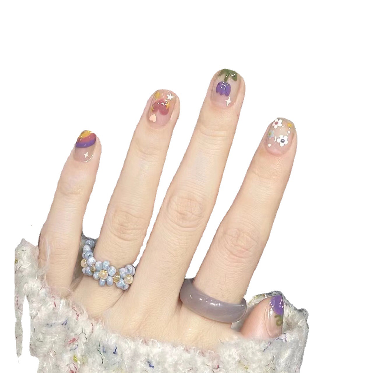 纯手工美甲穿戴甲指甲贴百搭可爱彩虹郁金香小花显白爱心学生短款