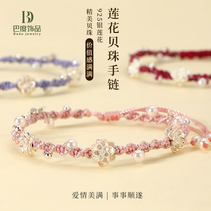 925银紫色贝珠银蝴蝶流苏手链女小众高级感春意绿手串编织手绳