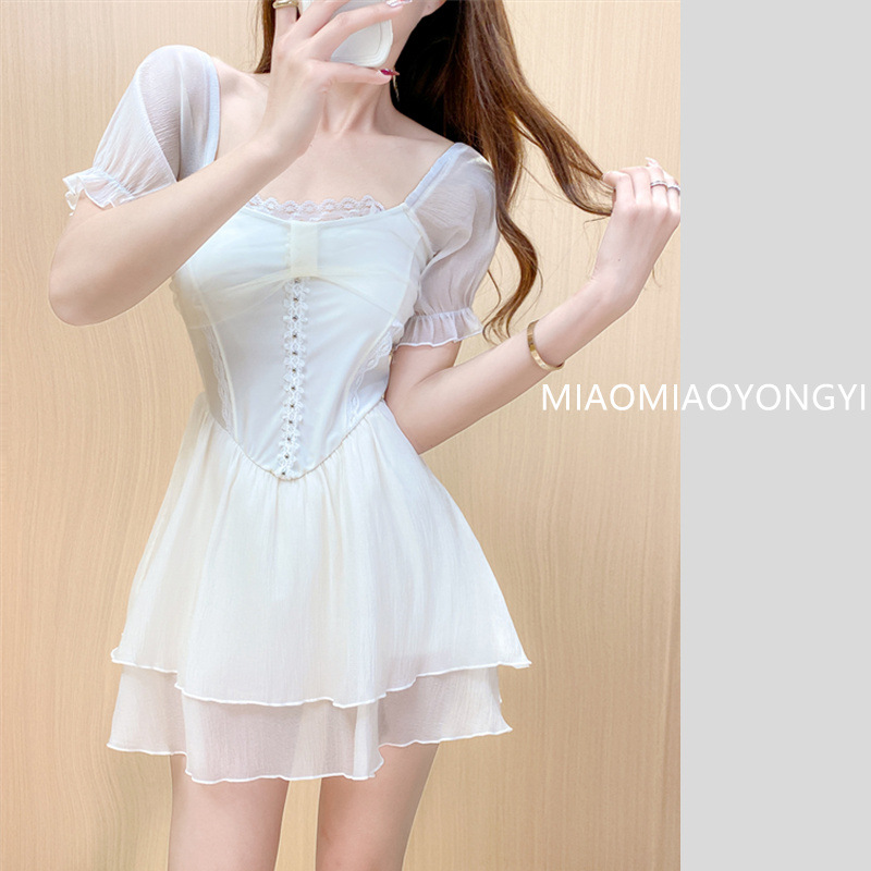 【初夏】仙气游泳衣女连体平角保守显瘦遮肚性感蕾丝遮肚温泉泳装