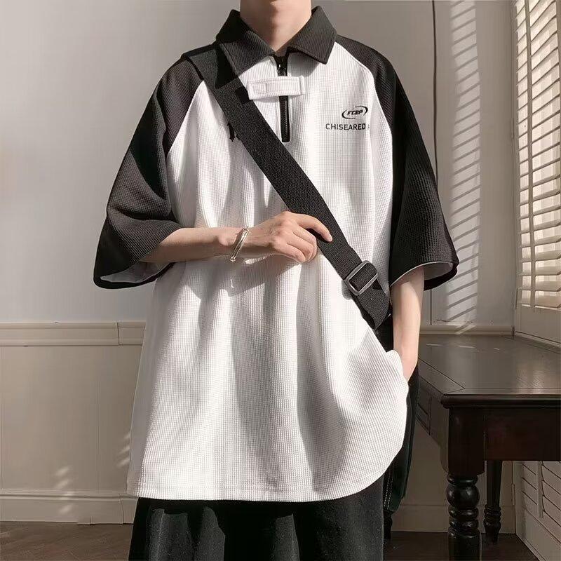 polo衫短袖t恤男生夏季新款美式复古街头宽松拼接撞色翻领体恤衫