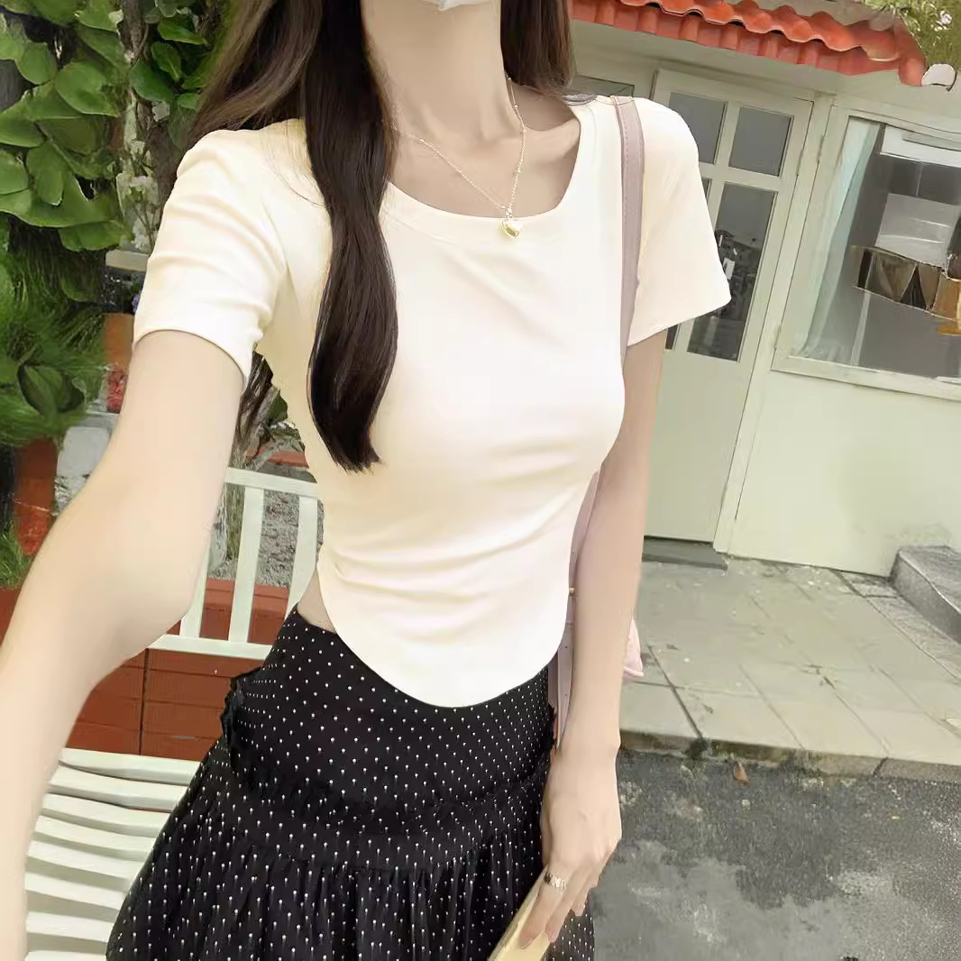 设计感不规则正肩短款短袖女夏新款韩版简约修身显瘦百搭T恤上衣