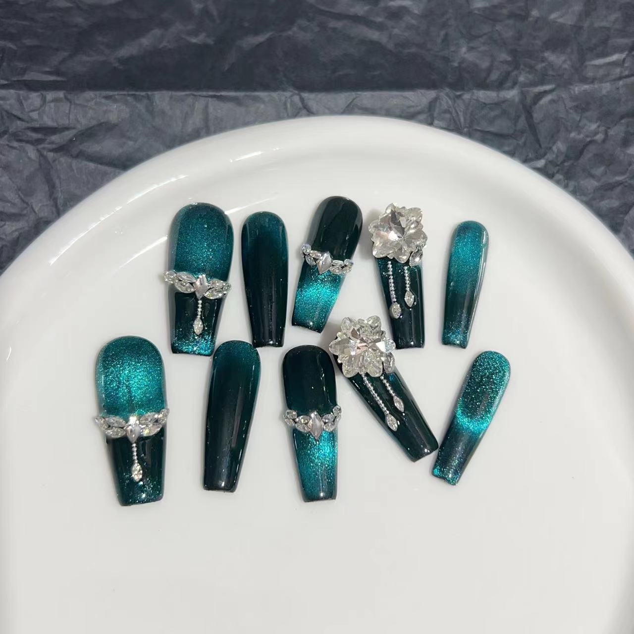 穿戴甲纯手工美甲成品假指甲贴片高级轻奢蓝色猫眼渐变爆闪K9钻