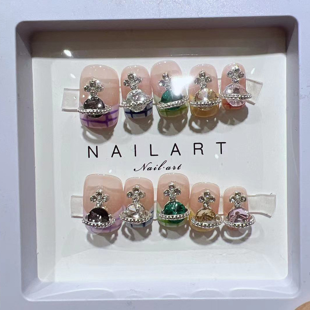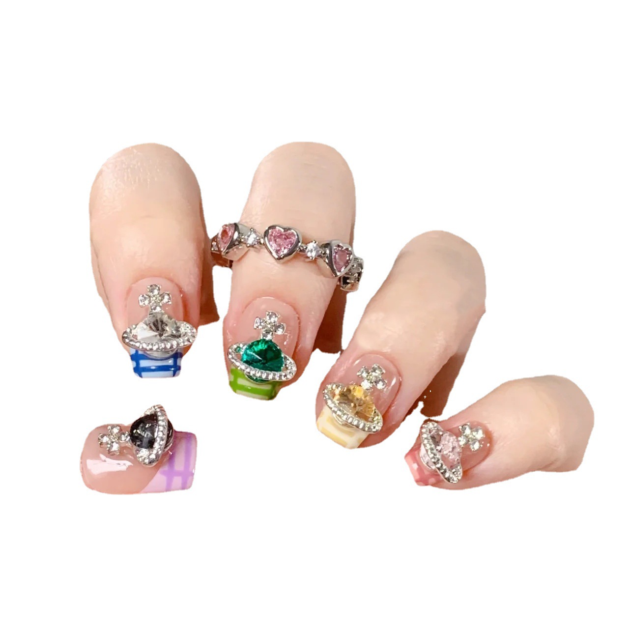 手工美甲穿戴甲假指甲贴小红书爆款新款轻奢爆闪土星彩钻短款学生