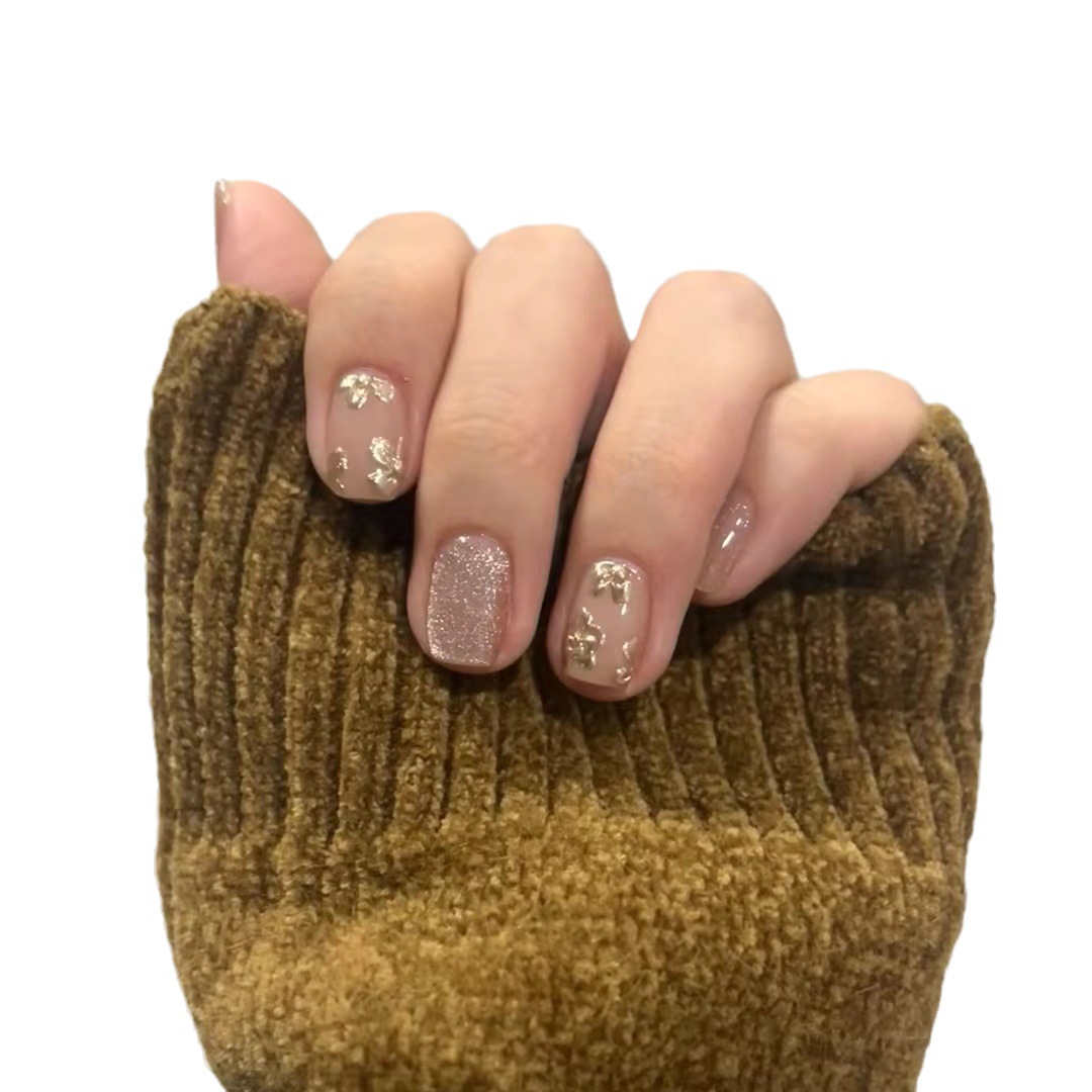 手工美甲穿戴甲假指甲贴片秋冬新款金色魔镜小花晶石猫眼美甲短款