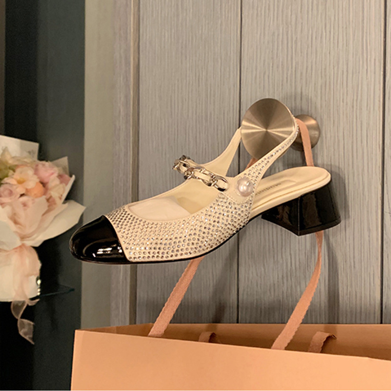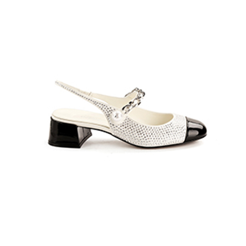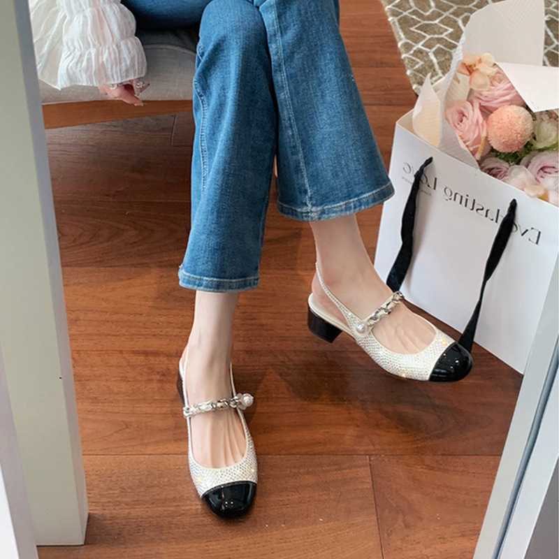 闪闪水钻后空圆头粗跟增高显瘦珍珠链条单鞋女