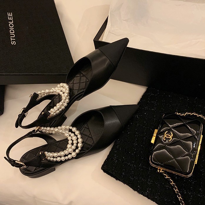 珍珠链条拼色粗跟中空真皮凉鞋一字扣带浅口尖头女鞋子