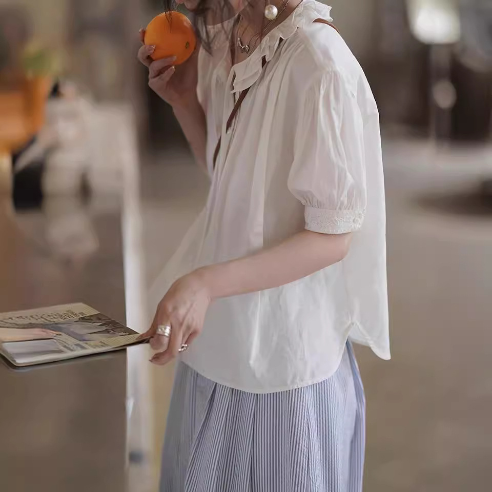 重工绣花 复古优雅花边领上衣女夏棉麻泡泡袖小众纯色衬衫