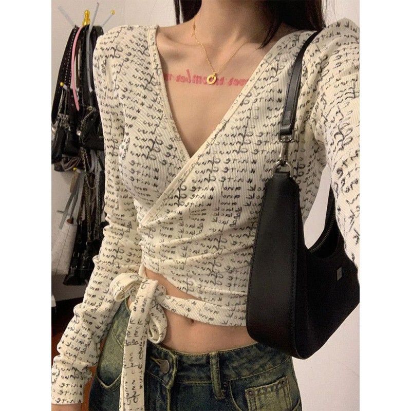 美式复古领低胸长袖恤女早秋季修身显瘦设计感小众辣妹短款上衣