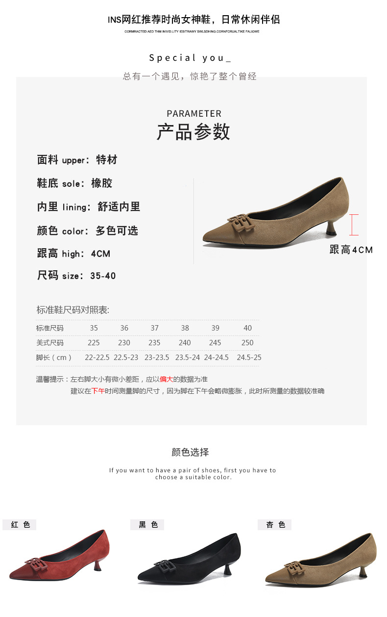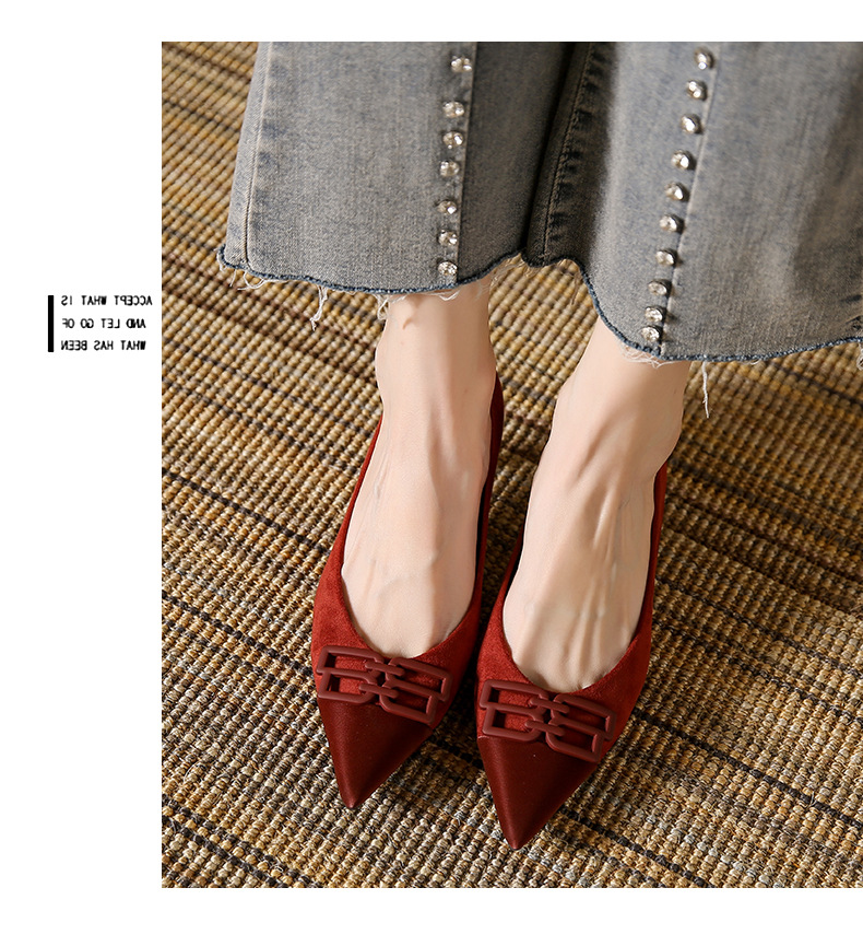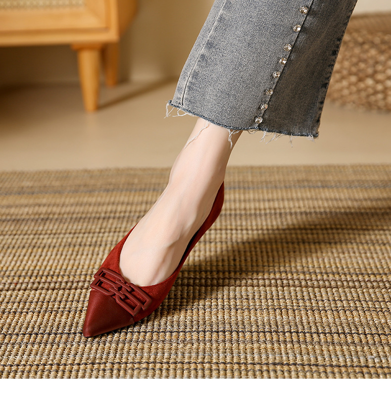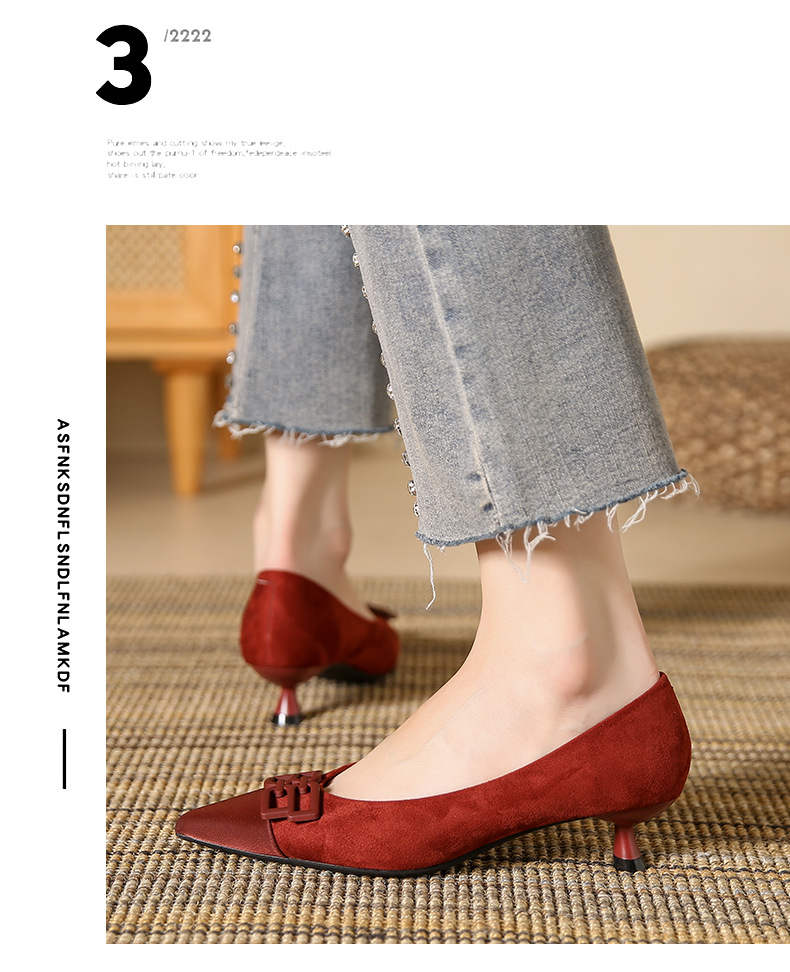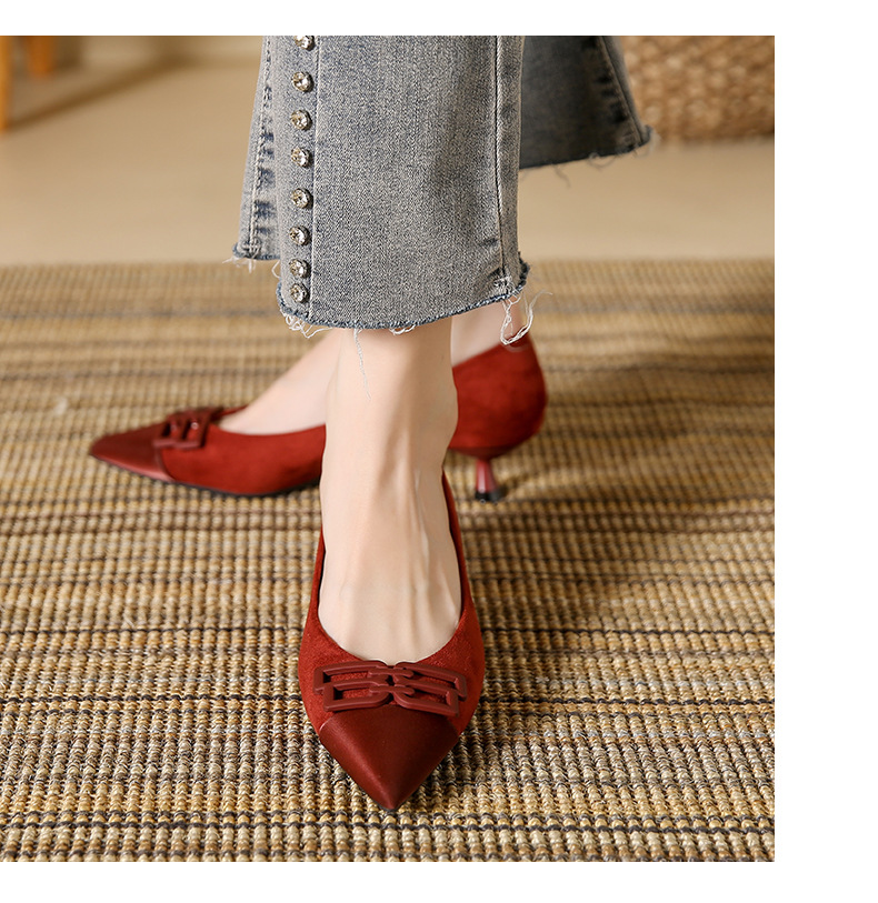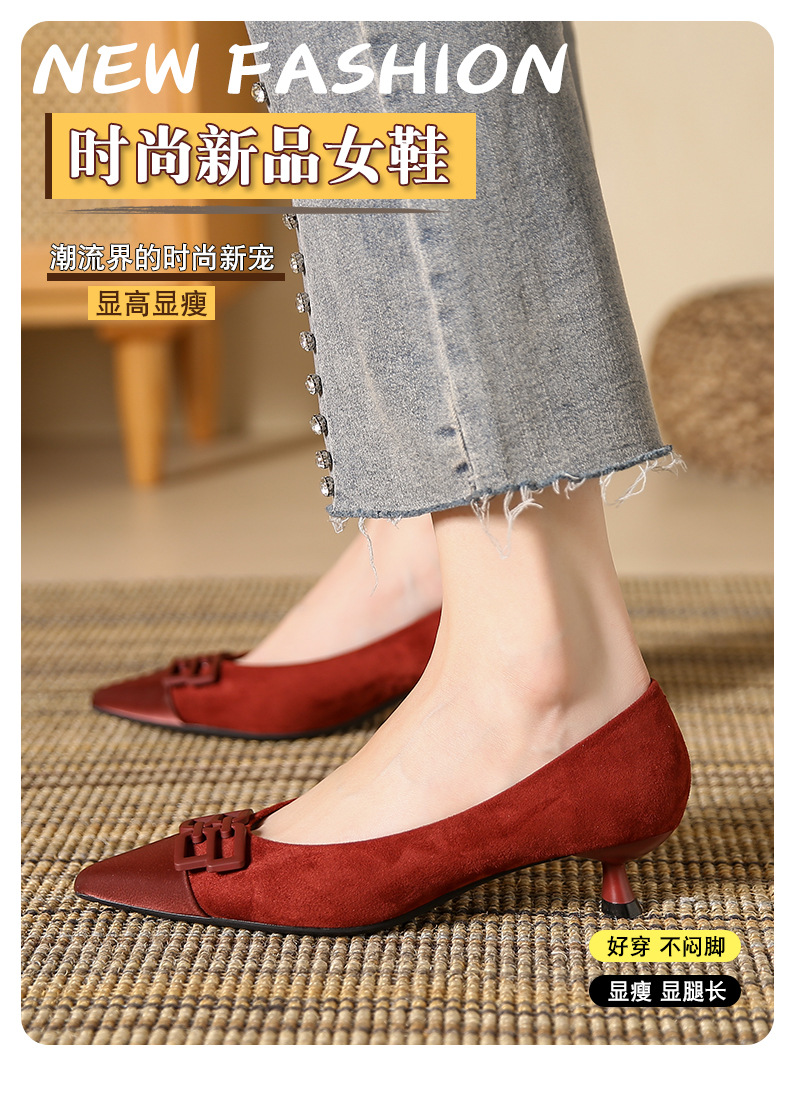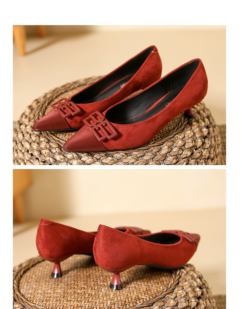 高跟鞋女新款尖头浅口细跟绒面方扣一脚蹬单鞋红色鞋子复古