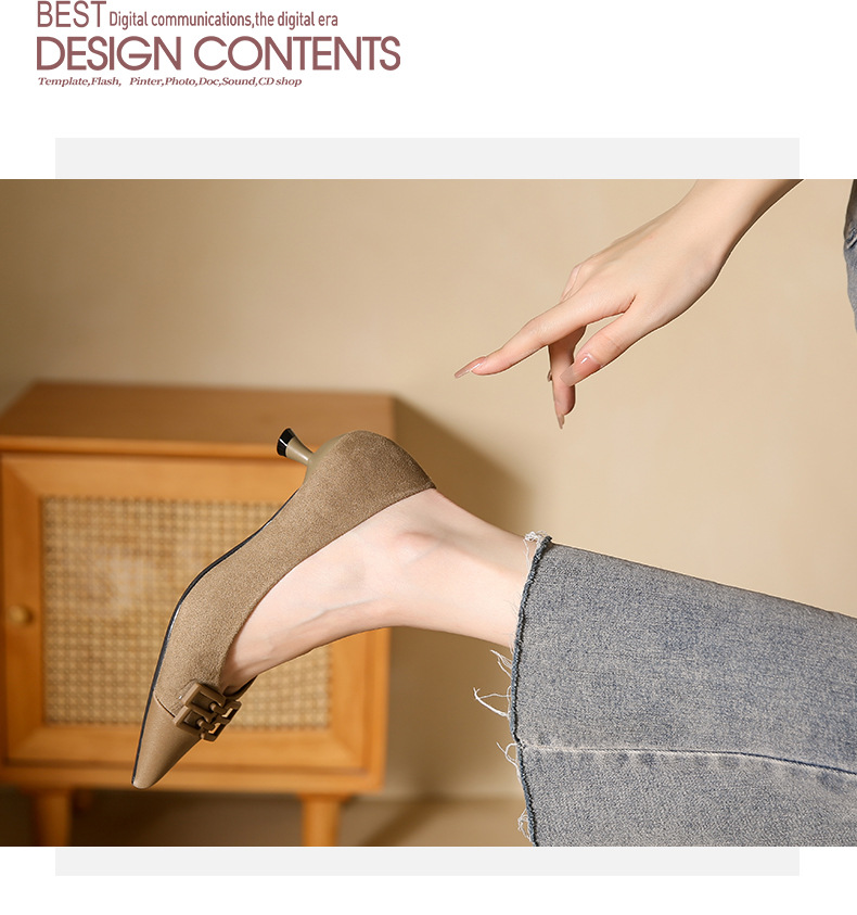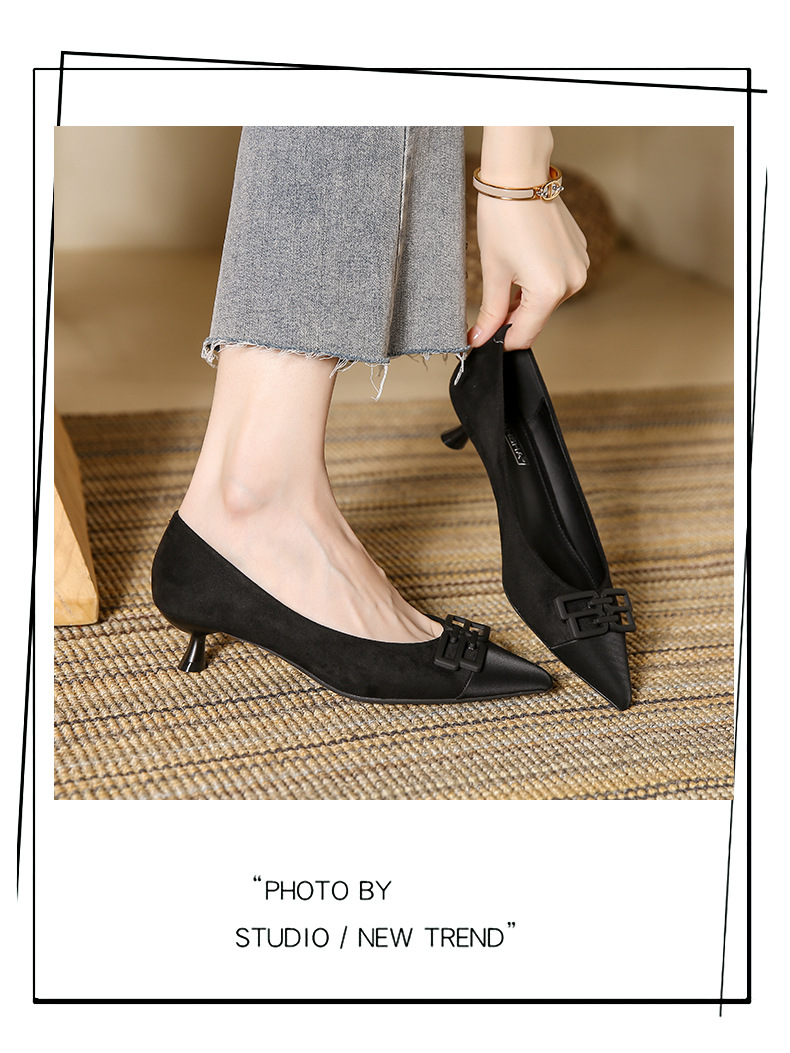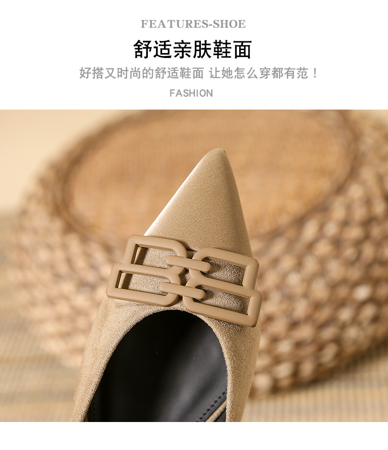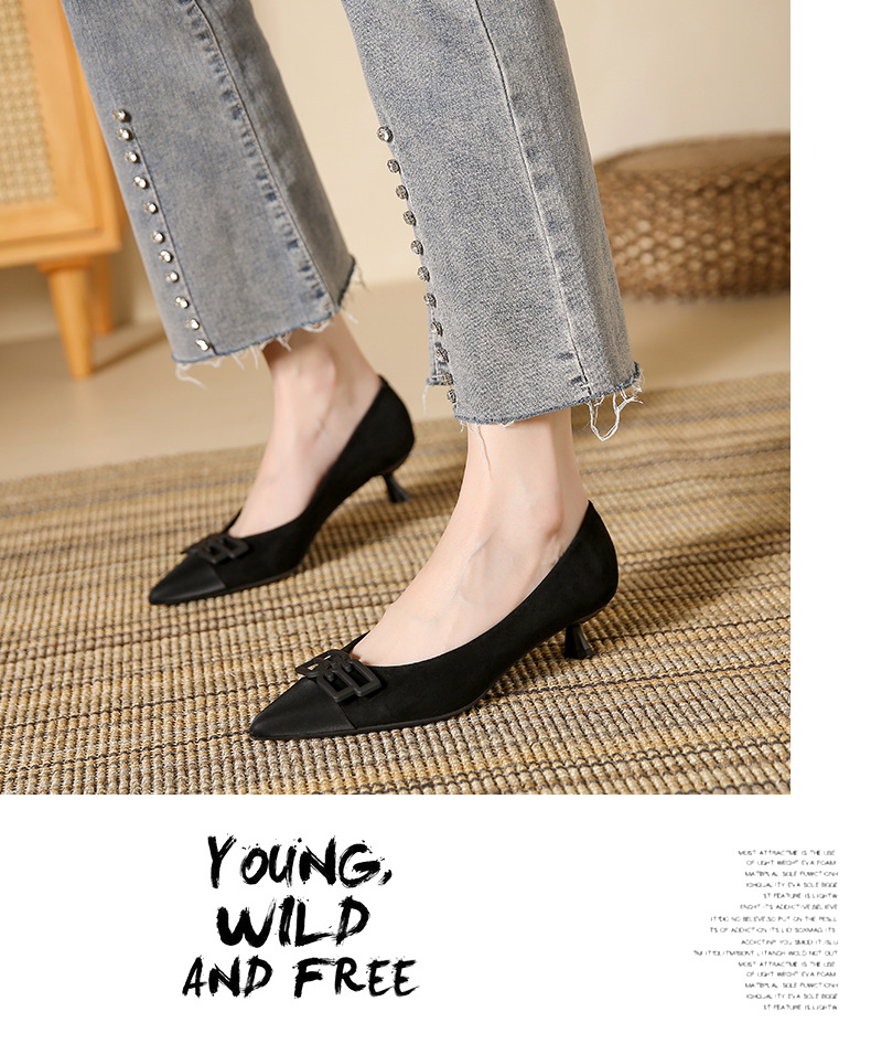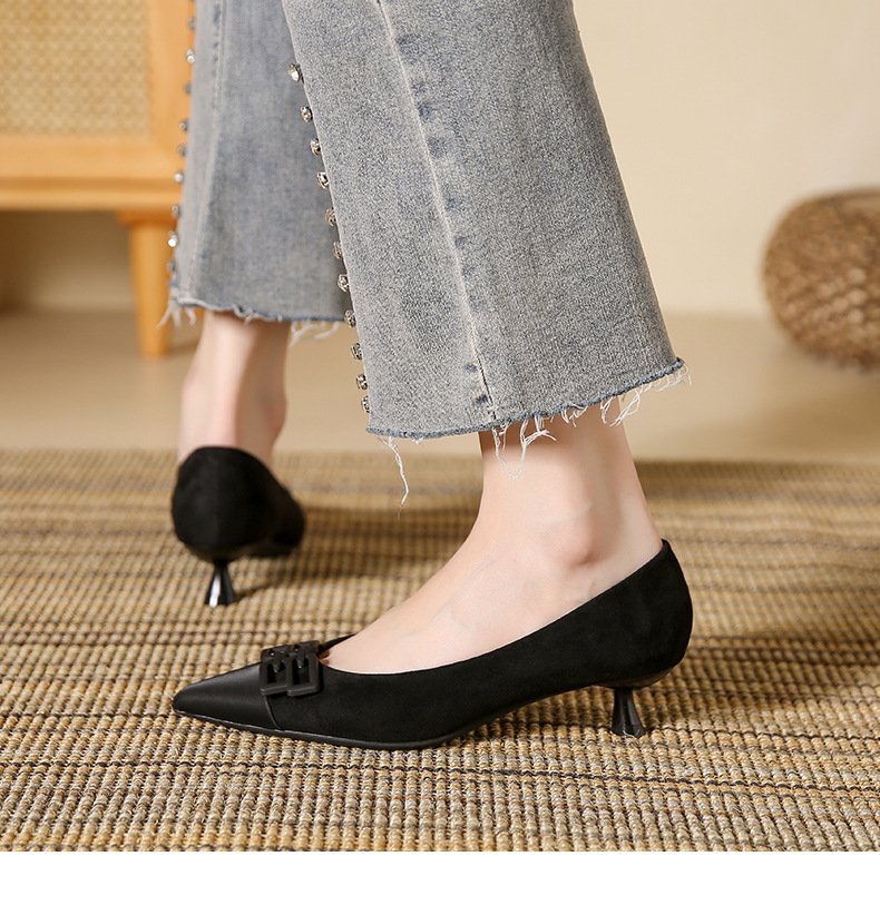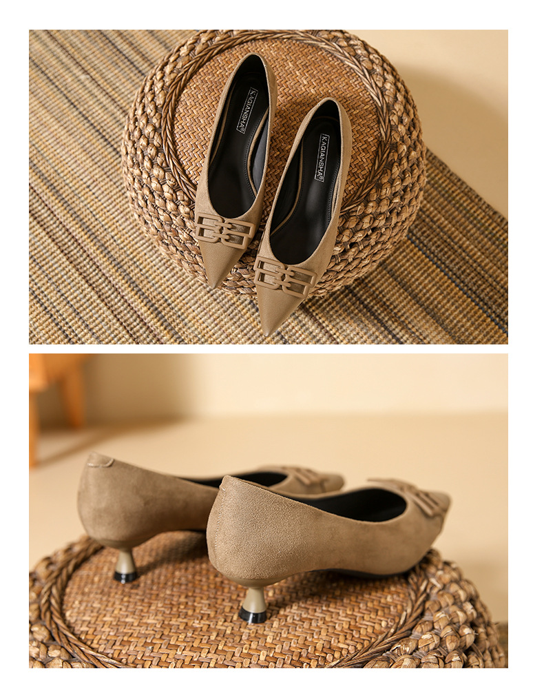 高跟鞋女新款尖头浅口细跟绒面方扣一脚蹬单鞋红色鞋子复古