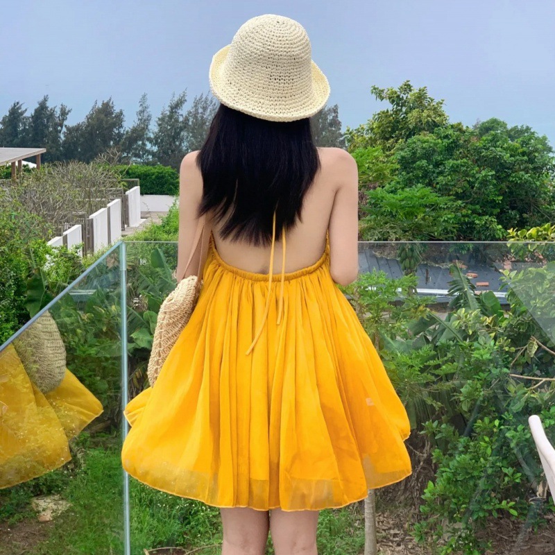 夏季新款漂亮法式气质欧货高级感度假风黄色露背吊带连衣裙女