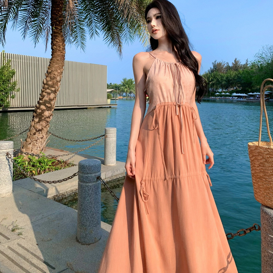 夏季新款 檀唇 粉橘藏花红抽皱棉麻感吊带连衣裙