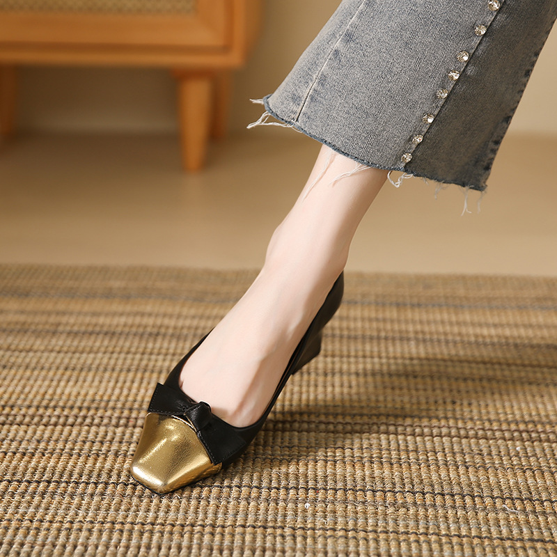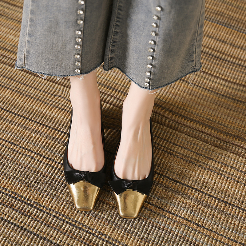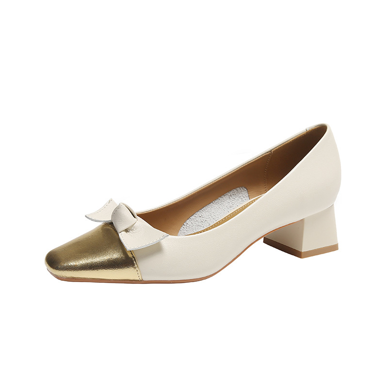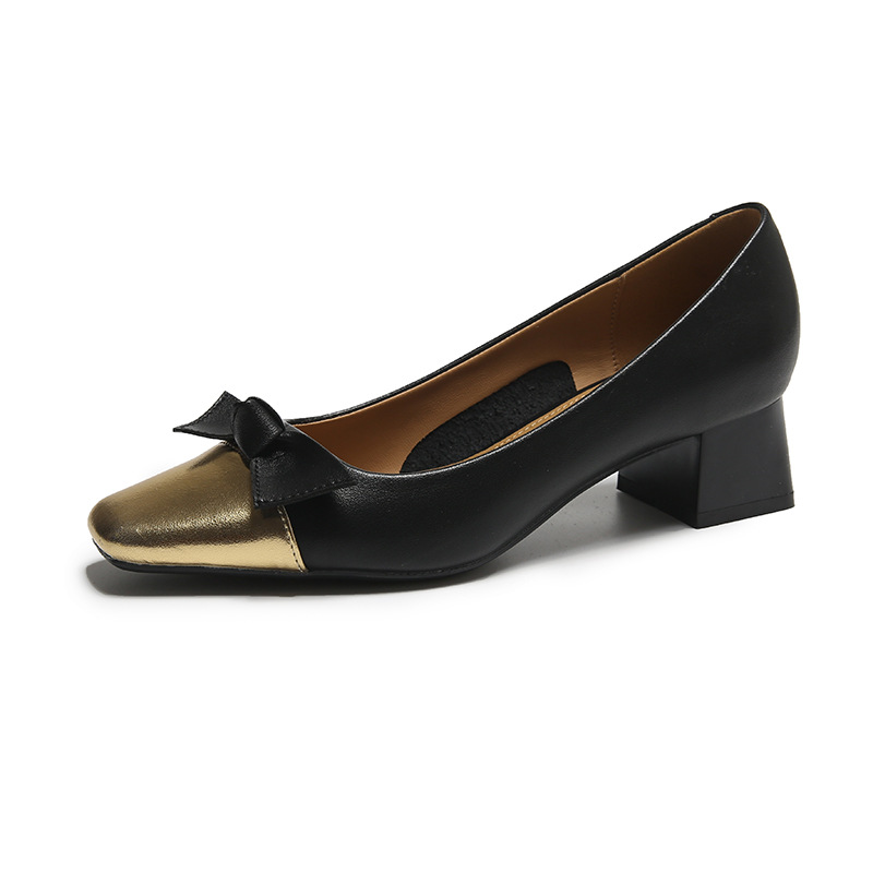 法式蝴蝶结单鞋女外出夏季新款浅口方头粗跟小皮鞋拼色小香风单鞋