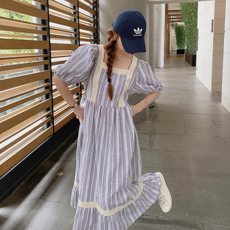 奶系黑白格纹连衣裙女夏季复古法式蕾丝方领显瘦森系桔梗长裙
