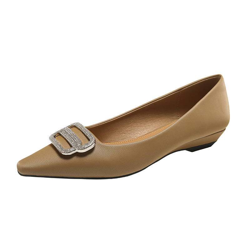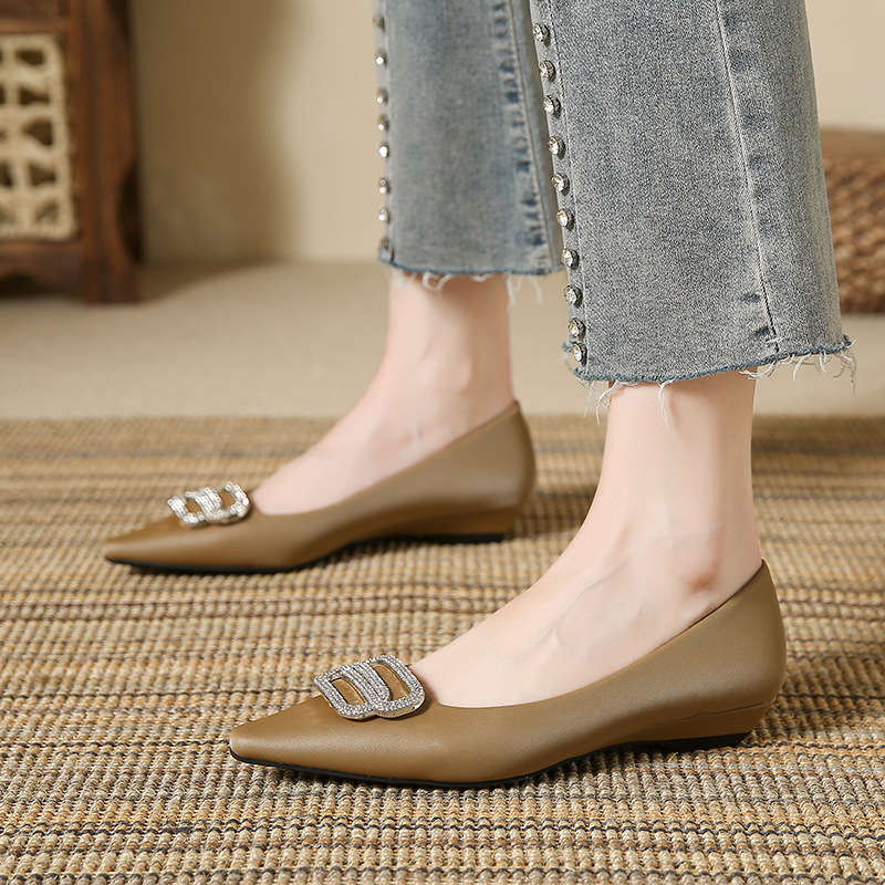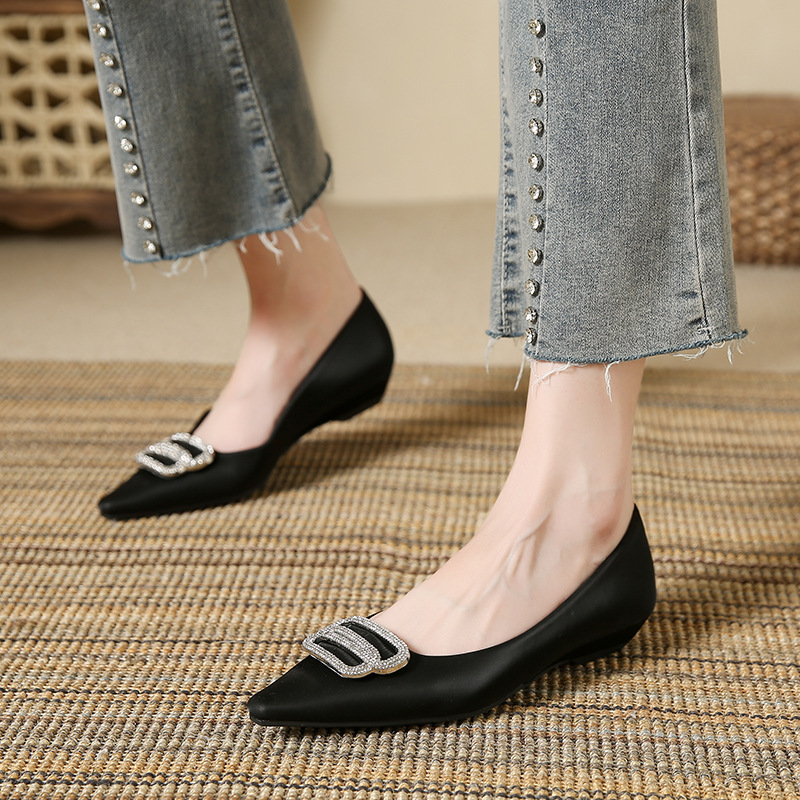 尖头小矮跟浅口瓢鞋新款真皮女鞋金属扣水钻显瘦女士鞋子