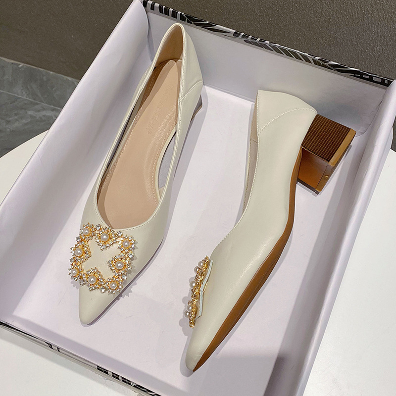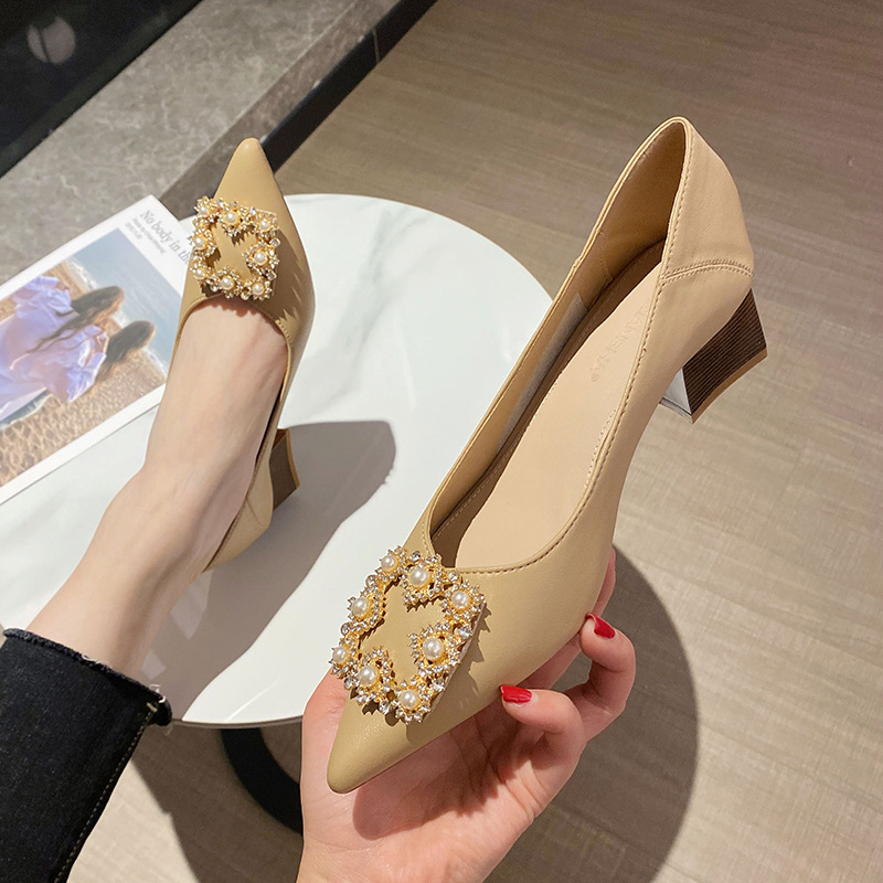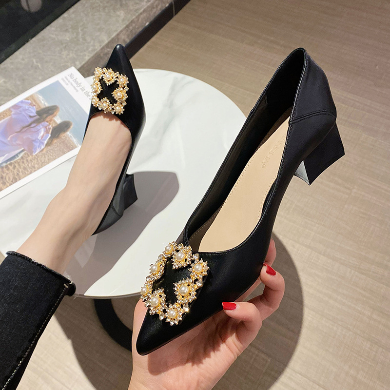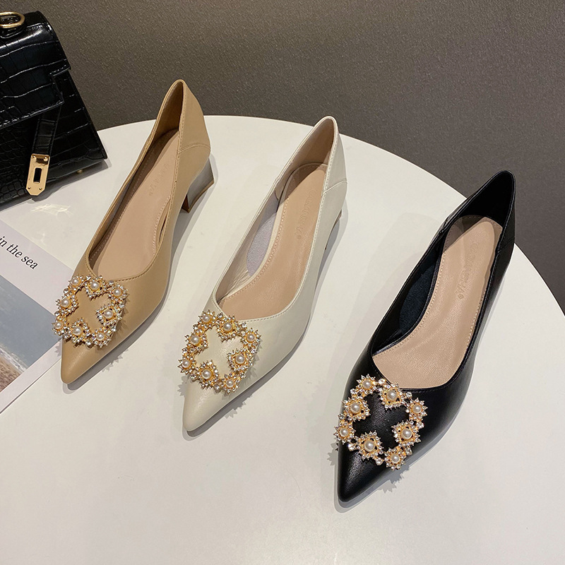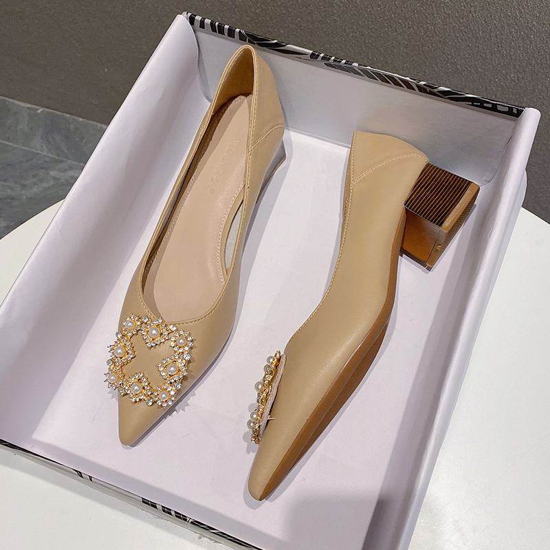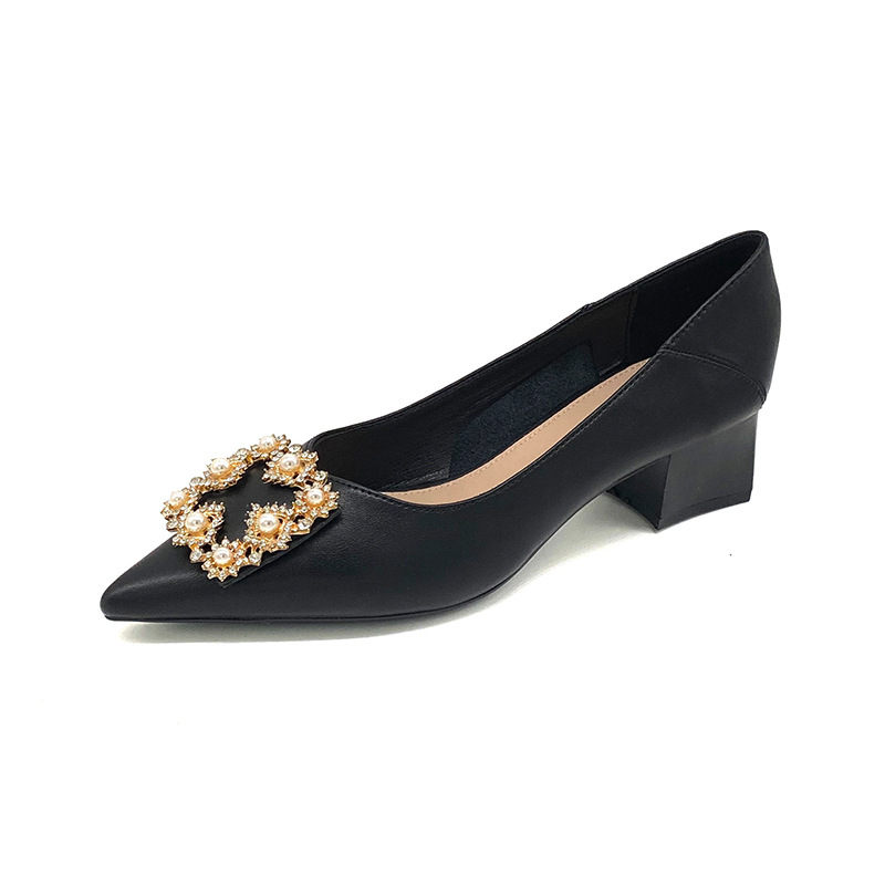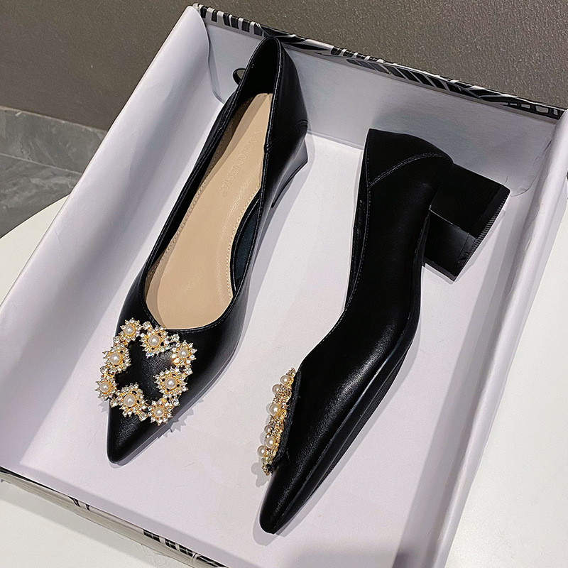 真牛皮女单鞋新款浅口中跟时尚扣饰女鞋尖头粗跟高跟鞋女