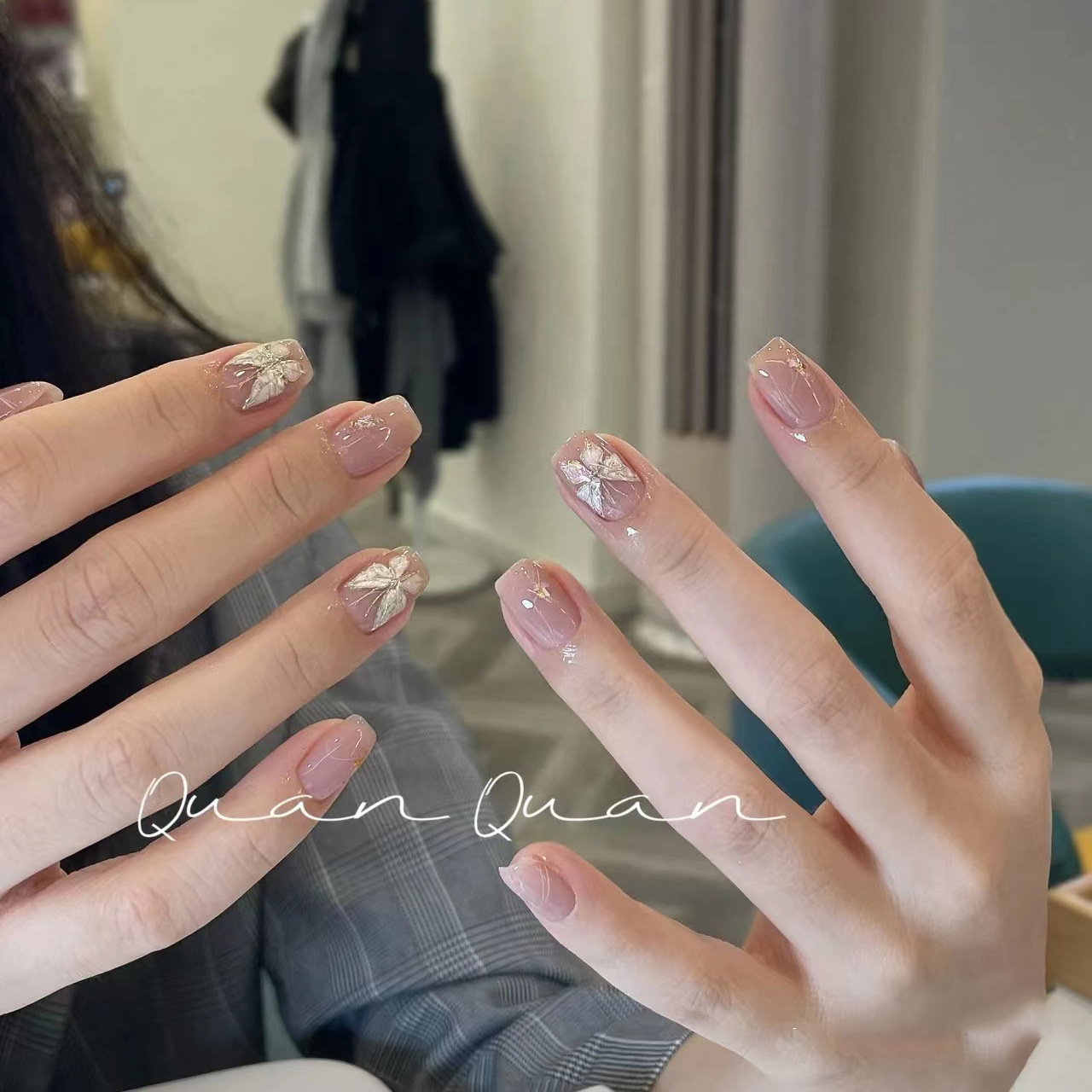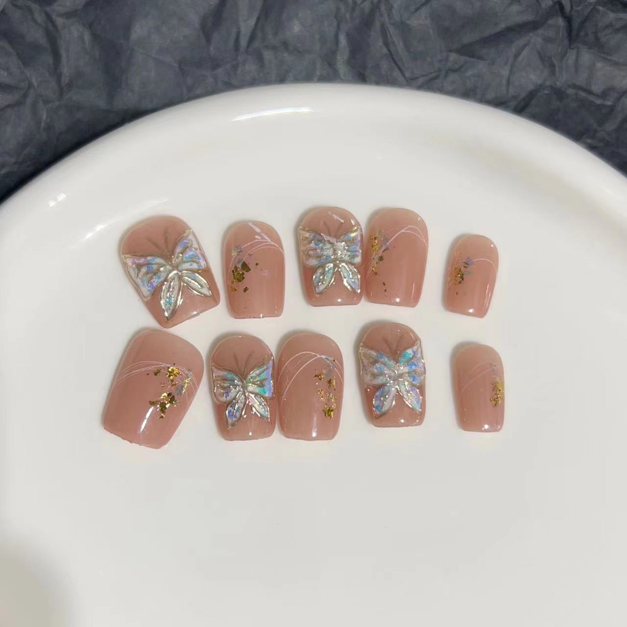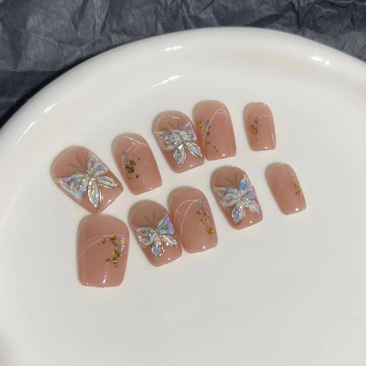 实拍穿戴甲纯手工美甲成品假指甲贴片新款裸色金箔手绘魔镜蝴蝶