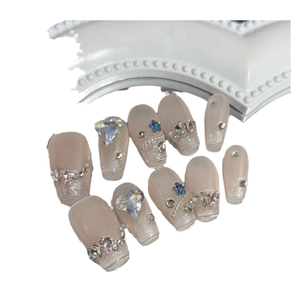 穿戴甲纯手工美甲成品假指甲贴片裸色猫眼法式炫彩爱心钻链条钢珠